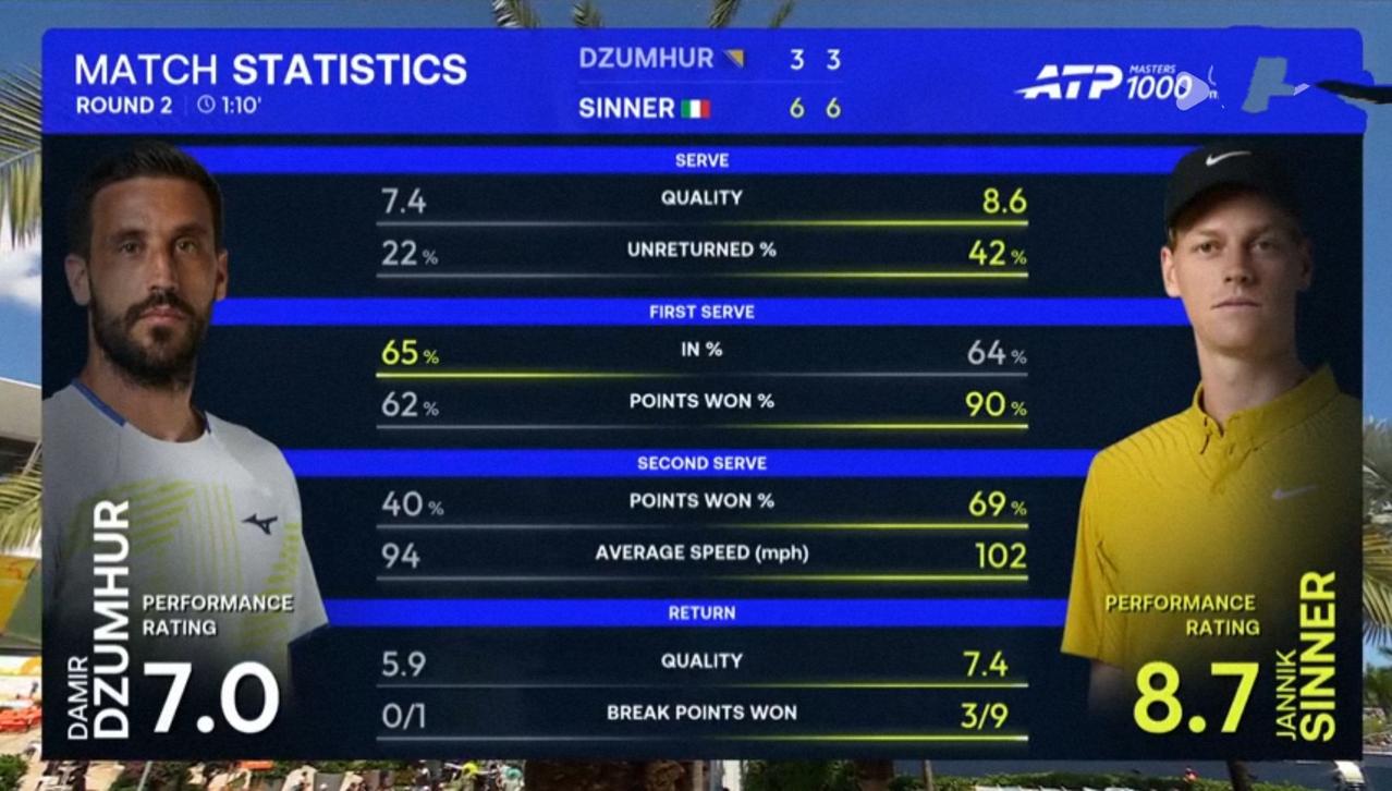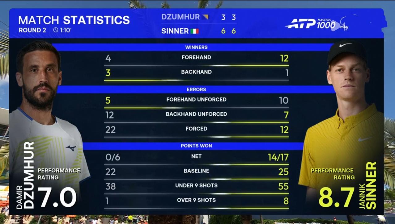 辛纳迈阿密大师赛以高达89.66%的一发得分率横扫德祖赫 北京时间2026年3月22日凌晨,迈阿密大师赛第二轮,辛纳对阵德祖赫。 结果,耗时1小时分10钟,辛纳以两个6:3的比分完胜德祖赫,顺利晋级。 第一盘。一上来辛纳连保带破取得3:0领先。第九局,辛纳发球胜盘局,直落四分保发。6:3,辛纳先下一城。 第二盘。第三局,辛纳直落四分破发,2:1。第九局,德祖赫退无可退发球局,仅得一分,遭遇破发。6:3,辛纳再下一城。 整场比赛,辛纳共轰出9记ACE,比对手多16记;发出2个双误,与对手持平;一发得分率高达89.66%,比对手高出27个多百分点;二发得分率68.75%,比对手高出28个多百分点;共拿到9个破发点,比对手多8个;成功破发3次,比对手多3次;总得分63分,比对手多24分。 这场比赛,辛纳发球状态爆棚,击球极具穿透力,对手根本没有任何机会。 由于这场比赛的胜利,辛纳在大师赛已经连续12场直落两盘获胜。