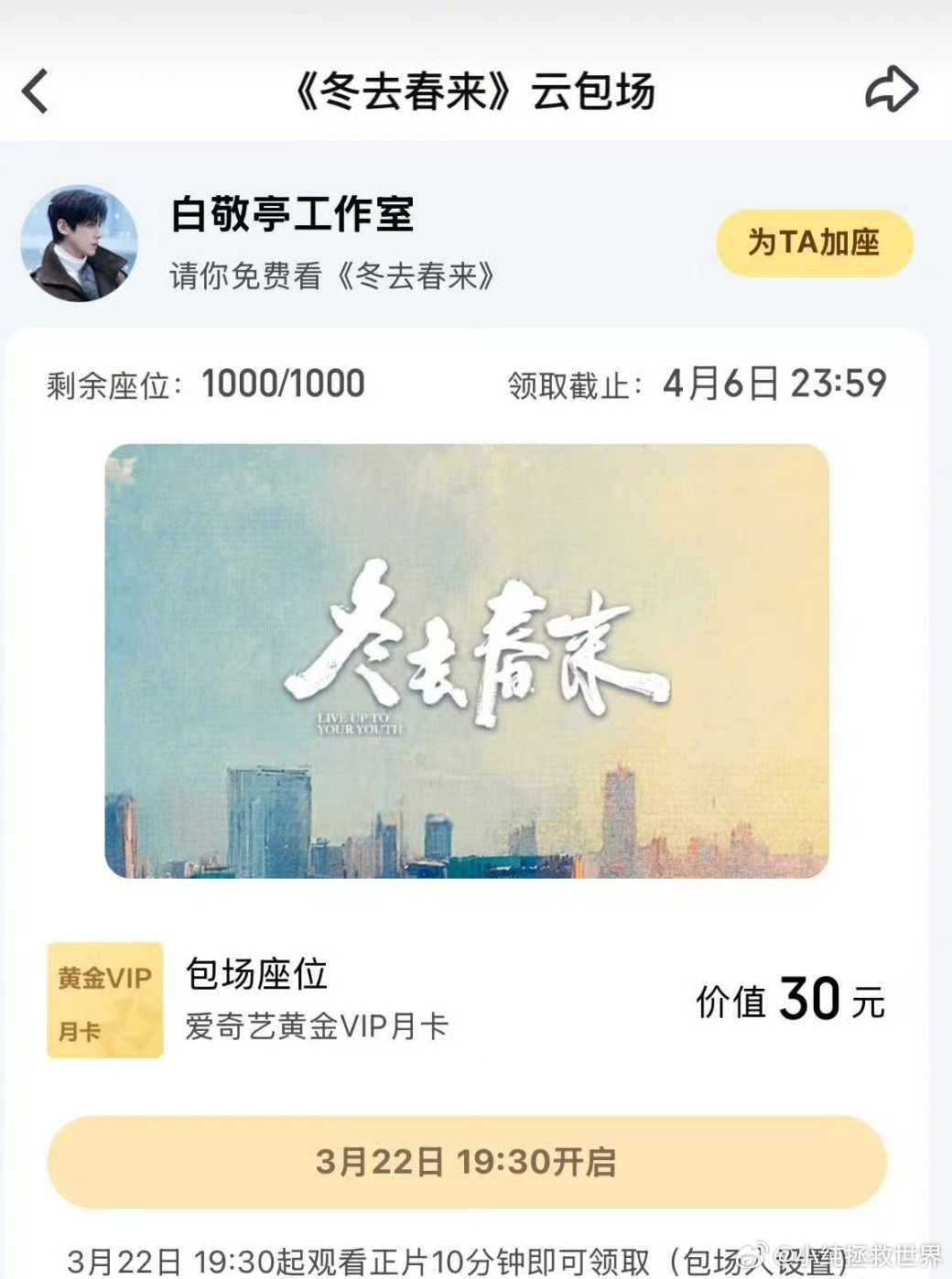 白敬亭包场章若楠冬去春来 我们以延别太好哄了,戏里温柔戏外大方,白敬亭直接包场支持章若楠新剧冬去春来,这份真诚又坦荡的友谊真的让人狠狠羡慕。