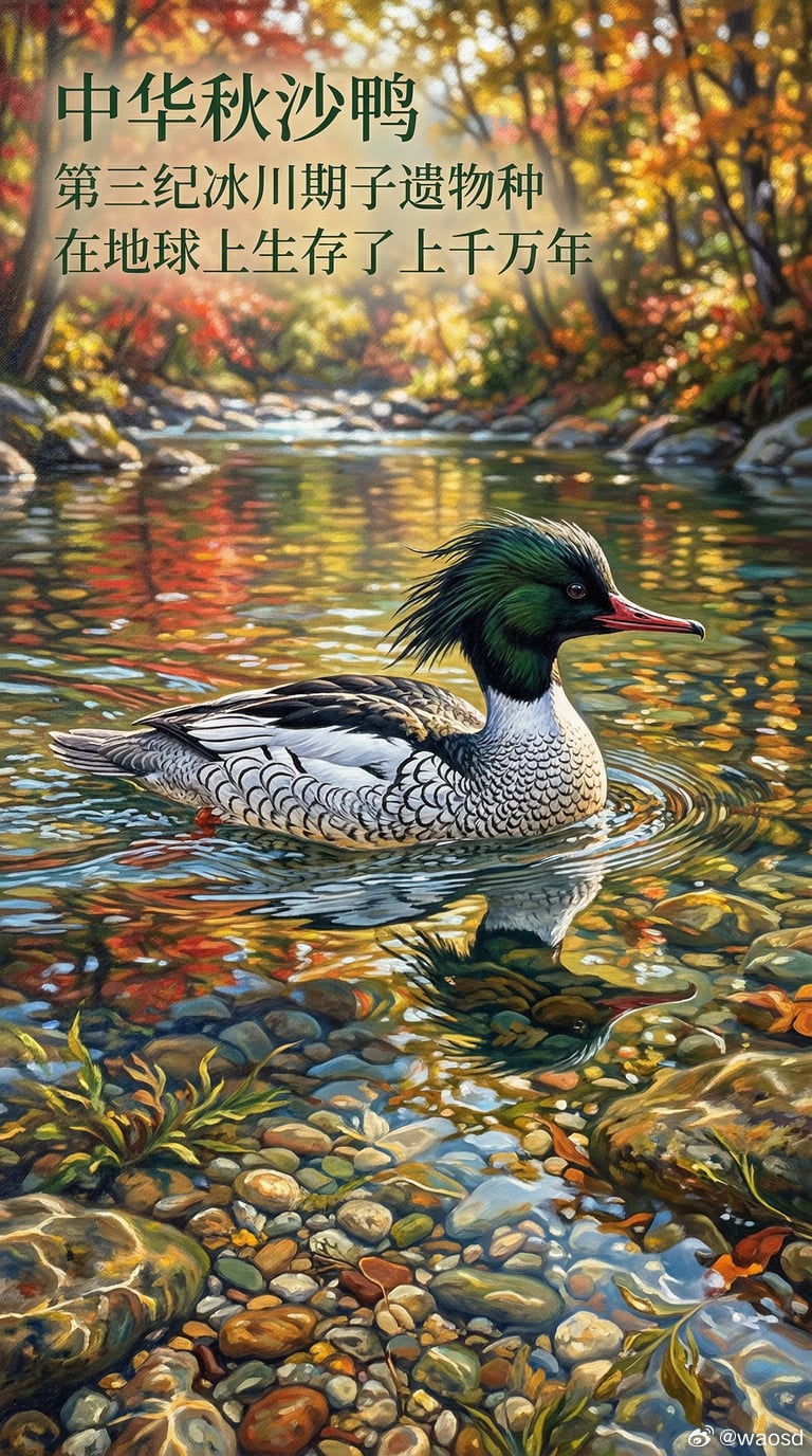 中华秋沙鸭。第三纪冰川期孑遗物种。在地球上生存了上千万年。