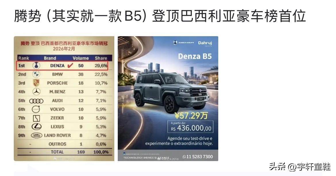 腾势靠方程豹豹5又在巴西首都露了回脸! 26年2月份,腾势B5(方程豹豹5)在巴西首都巴西利亚以50台的销量成绩,29.6%的市占率,夺得未加定语冠军! 要知道巴西的豹5售价可不是国内二十多万能比的,在巴西的售价超过58万,妥妥的豪车! 说真的,很想不通,像腾势这样的品牌,在国内、国外都没有啥知名度,但比亚迪还一直捧着不舍得放手,甚至还把方程豹豹系列出口挂在腾势品牌下面,方程豹这名字不比腾势霸气?就想问问,是国外不能用方程豹这个名字吗?