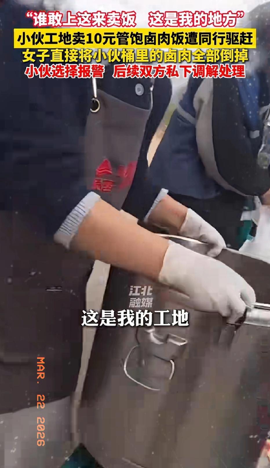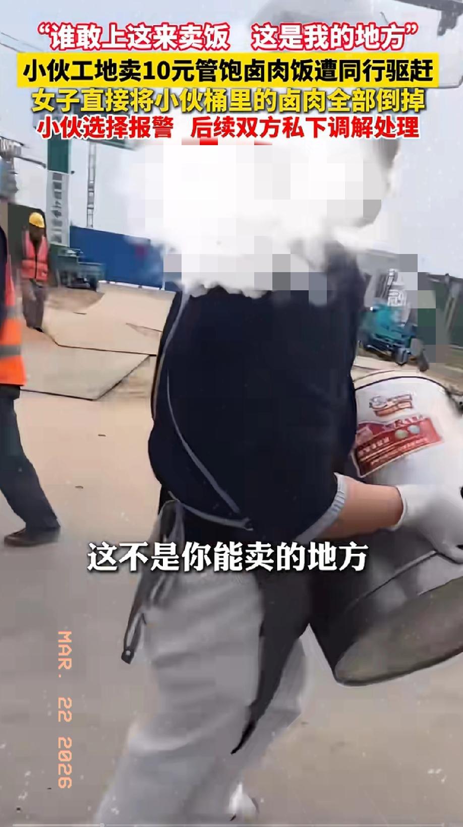 近日山东济南,一小伙在工地门口卖10元管饱的卤肉饭,谁料,刚卖了不到5分钟,一女子走了过来,对着小伙就骂! 女子说自己是在门口卖饭的,这是她的地方,你不能在这卖!随即将小伙的卤肉饭全给倒了,让小伙赶紧离开这里!小伙子气不过,这工地门口,不是随便都能卖吗?谁规定是你一个人卖的?小伙选择了报警! 民警到场后,对事情进行调查,女子说自己是和工地的工头谈好的,工人都到她摊位上吃饭,所以这里只能给她一个人卖!民警询问有工头联系方式没有,女子则说不方便透露!最终,在民警调解下,双方私下和解了!