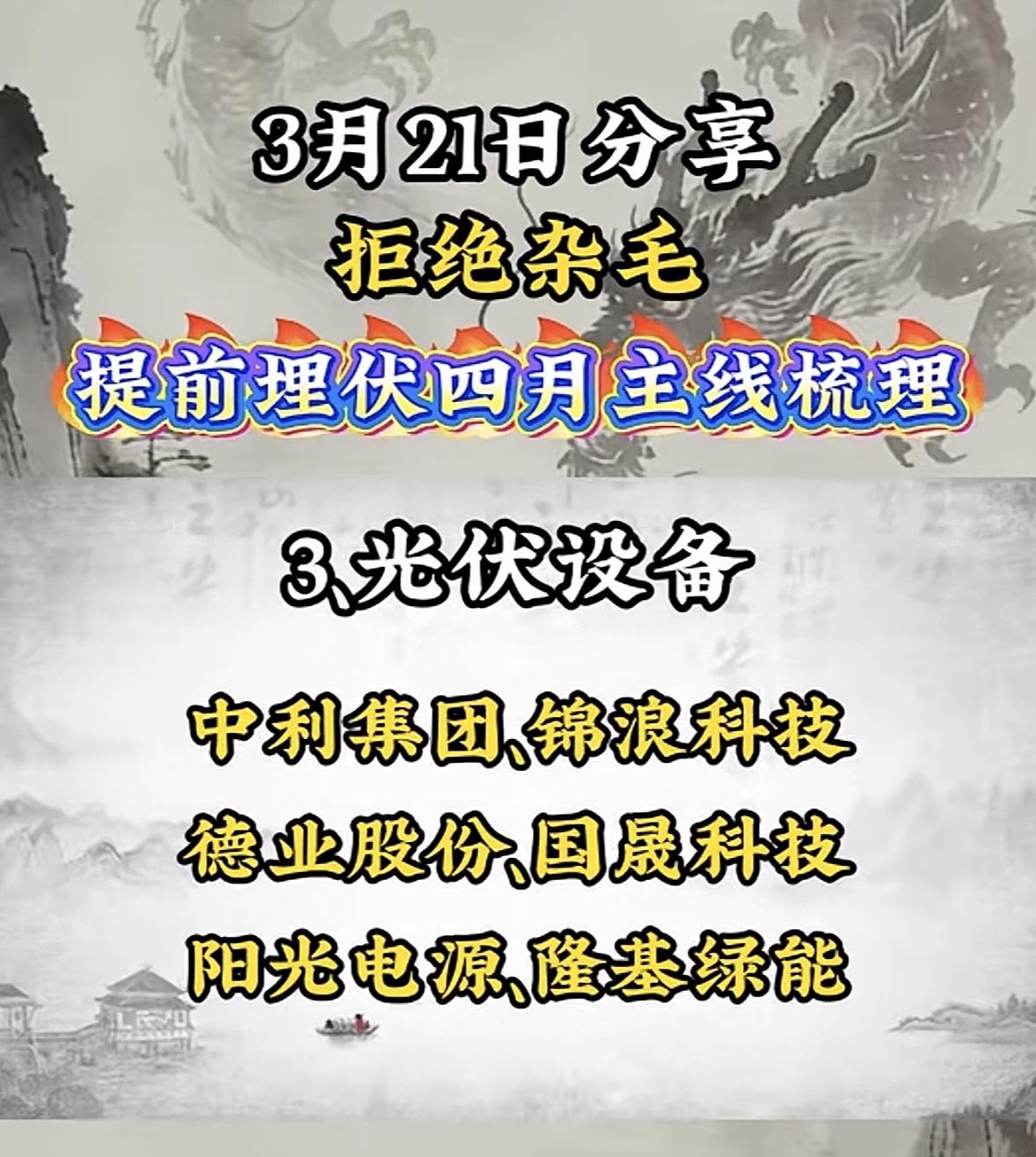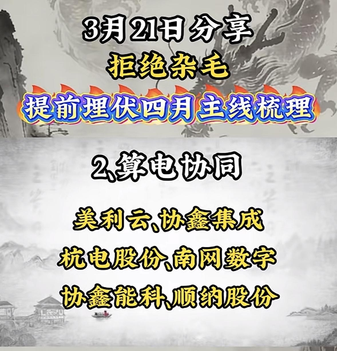 四月A股主线逐渐清晰,咱得拒绝杂毛,提前埋伏! 业绩线是关键,四月众多公司年报和一季报集中披露,像利欧股份、拓维信息等企业业绩预期不错,业绩好的公司更易获资金青睐,可多关注业绩预告超预期的。 算电协同是电力与算力深度融合的大趋势,美利云、协鑫集成等企业布局早,数字经济发展让算力需求大增,电力保障其运行,协同发展机会多。 光伏设备作为新能源主力军,发展势头猛,中利集团、锦浪科技等公司值得关注。在弱势A股行情下,聚焦这些主线,才能避免陷入“杂毛股”陷阱,抓住真正的机会。