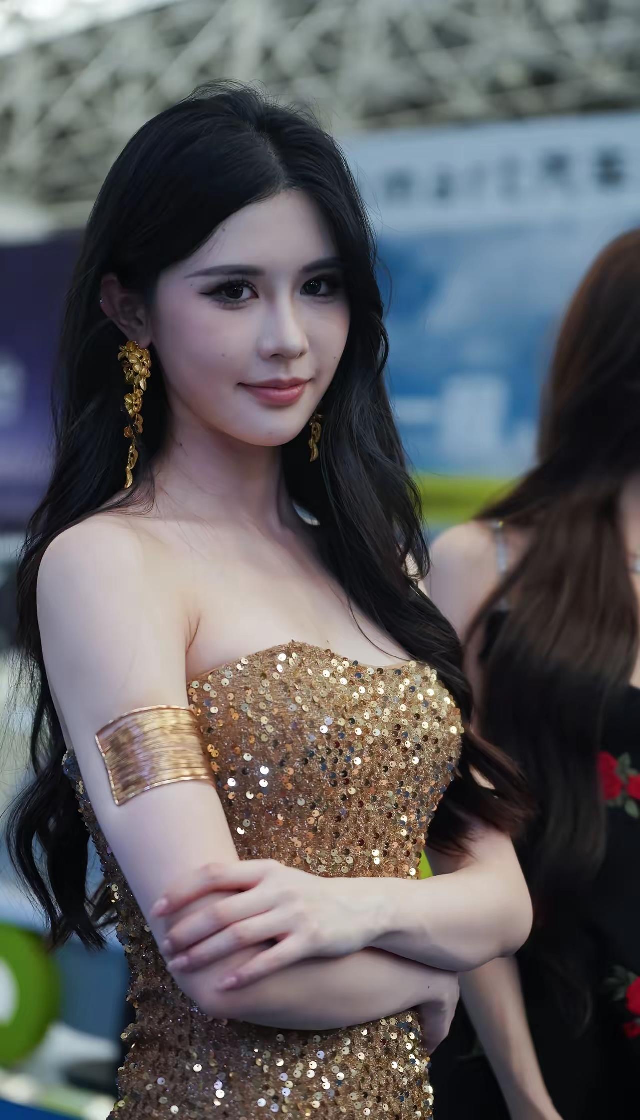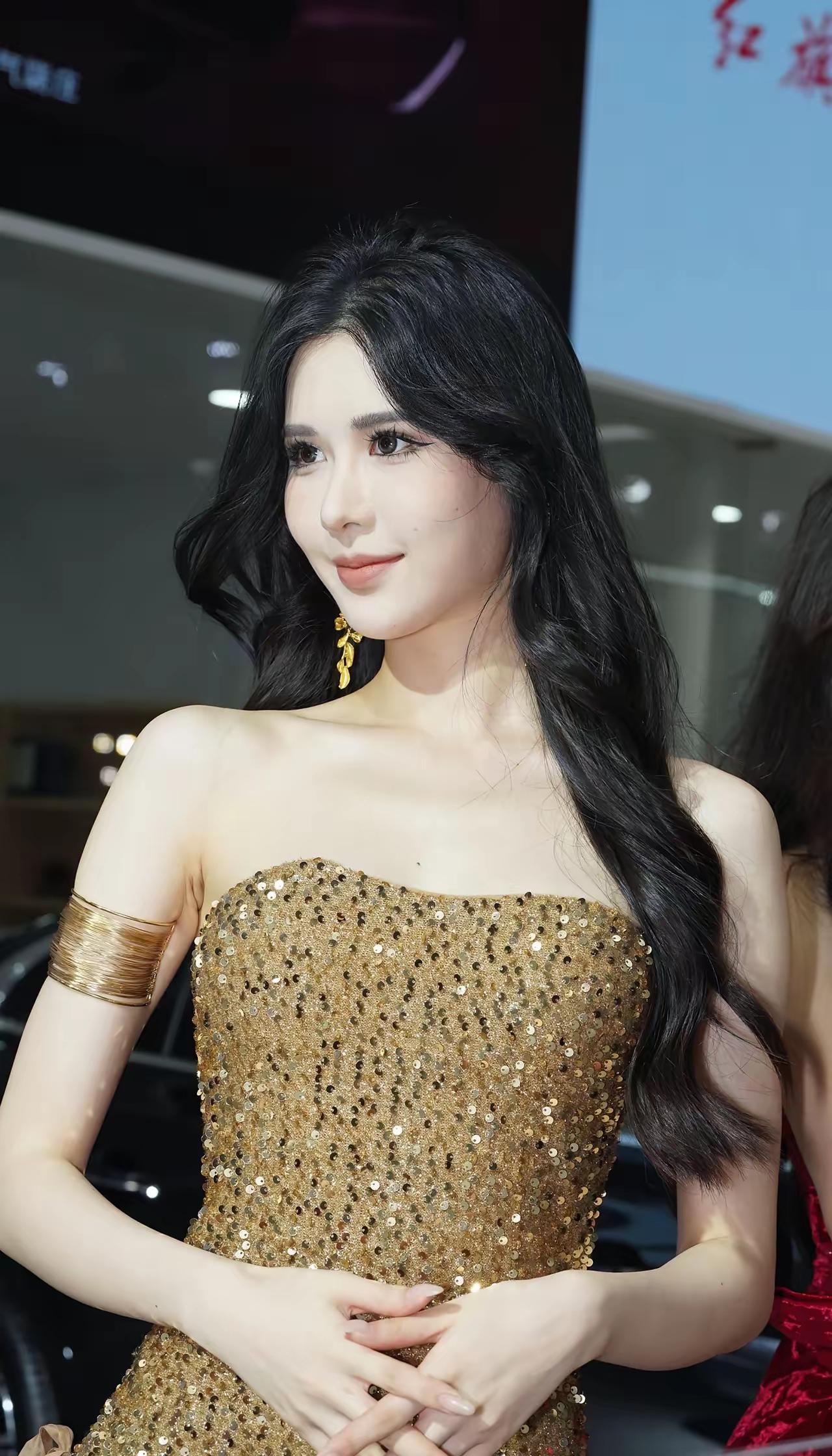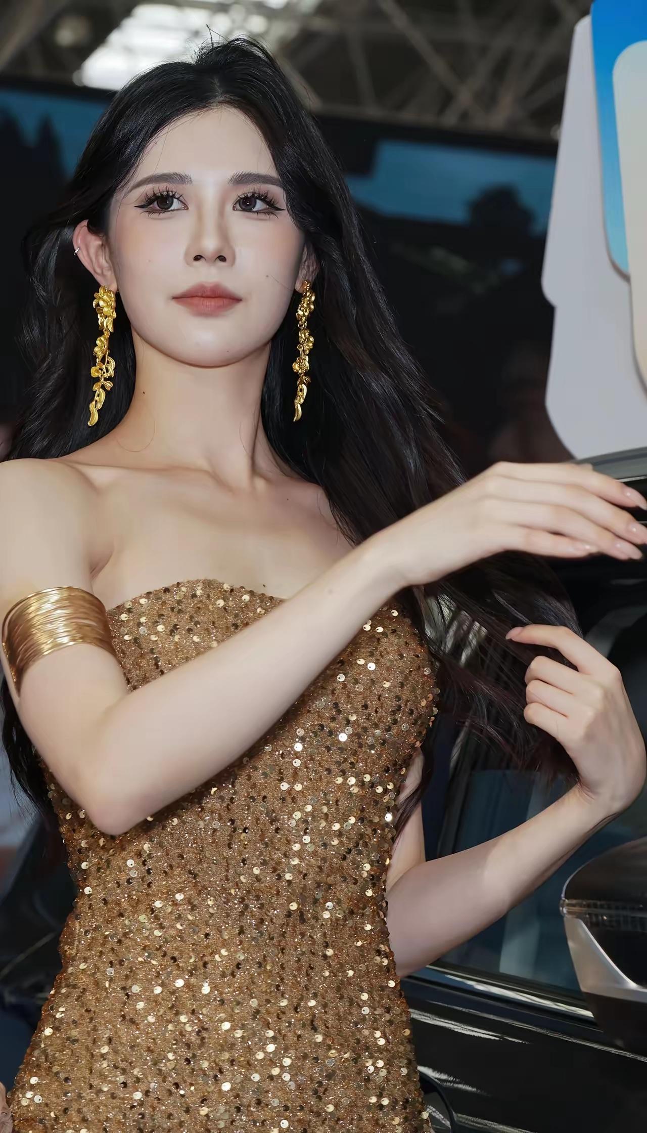 175模特敏儿改装车展金色裙装每天美丽照片分享 车展配车模是谁想出来的 汽车女神穿搭