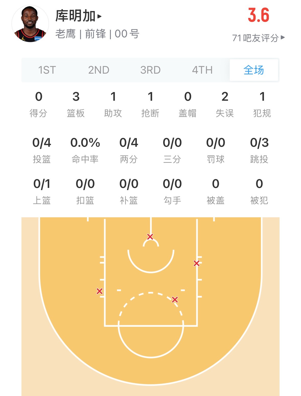 波杰半场4中1 有3个失误库名家半场4中0 有2个失误