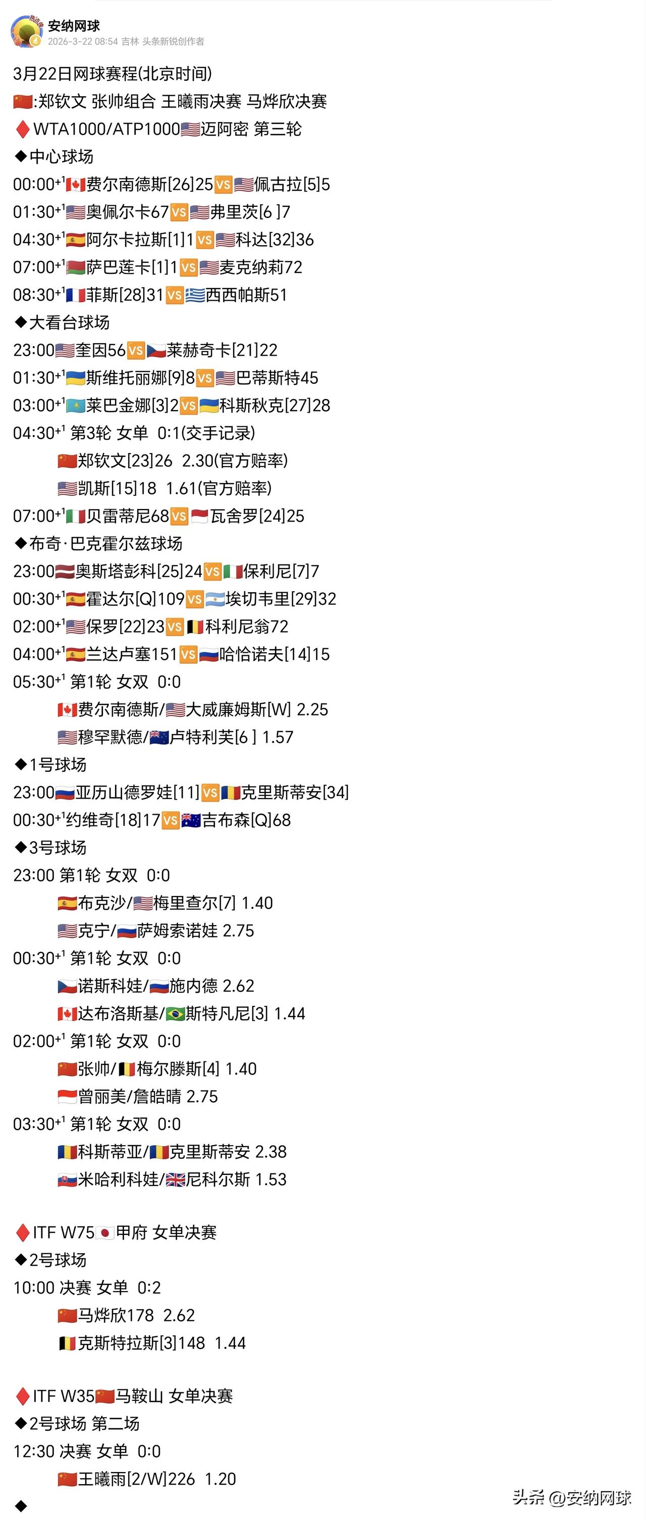 3月22日网球赛程(北京时间) 🇨🇳:郑钦文 张帅组合 王曦雨决赛 马烨欣决赛 ♦WTA1000/ATP1000🇺🇸迈阿密 第三轮 ◆中心球场 00:00⁺¹🇨🇦费尔南德斯[26]25🆚🇺🇸佩古拉[5]5 01:30⁺¹🇺🇸奥佩尔卡67🆚🇺🇸弗里茨[6 ]7 04:30⁺¹🇪🇸阿尔卡拉斯[1]1🆚🇺🇸科达[32]36 07:00⁺¹🇧🇾萨巴莲卡[1]1🆚🇺🇸麦克纳莉72 08:30⁺¹🇫🇷菲斯[28]31🆚🇬🇷西西帕斯51 ◆大看台球场 23:00🇺🇸奎因56🆚🇨🇿莱赫奇卡[21]22 01:30⁺¹🇺🇦斯维托丽娜[9]8🆚🇺🇸巴蒂斯特45 03:00⁺¹🇰🇿莱巴金娜[3]2🆚🇺🇦科斯秋克[27]28 04:30⁺¹ 第3轮 女单 0:1(交手记录) 🇨🇳郑钦文[23]26 2.30(官方赔率) 🇺🇸凯斯[15]18 1.61(官方赔率) 07:00⁺¹🇮🇹贝雷蒂尼68🆚🇲🇨瓦舍罗[24]25 ◆布奇·巴克霍尔兹球场 23:00🇱🇻奥斯塔彭科[25]24🆚🇮🇹保利尼[7]7 00:30⁺¹🇪🇸霍达尔[Q]109🆚🇦🇷埃切韦里[29]32 02:00⁺¹🇺🇸保罗[22]23🆚🇧🇪科利尼翁72 04:00⁺¹🇪🇸兰达卢塞151🆚🇷🇺哈恰诺夫[14]15 05:30⁺¹ 第1轮 女双 0:0 🇨🇦费尔南德斯/🇺🇸大威廉姆斯[W] 2.25 🇺🇸穆罕默德/🇳🇿卢特利芙[6 ] 1.57 ◆1号球场 23:00🇷🇺亚历山德罗娃[11]🆚🇷🇴克里斯蒂安[34] 00:30⁺¹约维奇[18]17🆚🇦🇺吉布森[Q]68 ◆3号球场 23:00 第1轮 女双 0:0 🇪🇸布克沙/🇺🇸梅里查尔[7] 1.40 🇺🇸克宁/🇷🇺萨姆索诺娃 2.75 00:30⁺¹ 第1轮 女双 0:0 🇨🇿诺斯科娃/🇷🇺施内德 2.62 🇨🇦达布洛斯基/🇧🇷斯特凡尼[3] 1.44 02:00⁺¹ 第1轮 女双 0:0 🇨🇳张帅/🇧🇪梅尔滕斯[4] 1.40 🇮🇩曾丽美/詹皓晴 2.75 03:30⁺¹ 第1轮 女双 0:0 🇷🇴科斯蒂亚/🇷🇴克里斯蒂安 2.38 🇸🇰米哈利科娃/🇬🇧尼科尔斯 1.53 ♦ITF W75🇯🇵甲府 女单决赛 ◆2号球场 10:00 决赛 女单 0:2 🇨🇳马烨欣178 2.62 🇧🇪克斯特拉斯[3]148 1.44 ♦ITF W35🇨🇳马鞍山 女单决赛 ◆2号球场 第二场 12:30 决赛 女单 0:0 🇨🇳王曦雨[2/W]226 1.20 ◆