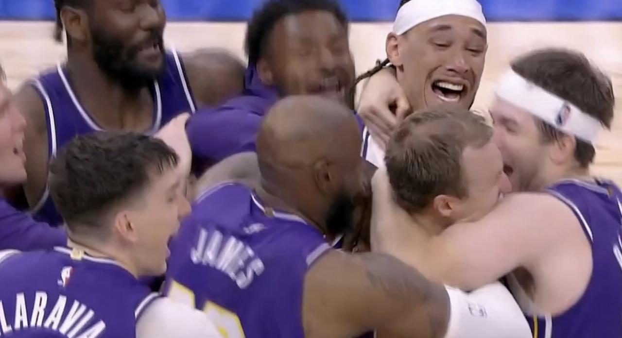 最后0.06秒,肯纳德把詹姆斯拉出会议室啊! 最后4.2秒,湖人落后2分,斯玛特一个完美传球,给到篮下无人防守的詹姆斯,但他拿球后,没有直接选择上篮或者扣篮,而是瞄到身后班凯罗补防过来,他做了个虚晃的动作,却不料,再次起身时还是被帽出界了! 说实话,这一球,且不说班凯罗有犯规嫌疑,但如果是年轻的詹姆斯,可能直接就霸气扣篮了,管你身后是否有人补防! 而这次完美传球,最终也因为被帽出界而告终!不过还好湖人保留球权,接着斯玛特继续完美操作,直接传给了弧顶跑出空位的肯纳德,后者接球果断出手,三分命中,湖人绝杀了! 如果不是肯纳德这次三分命中,湖人就输了,赛后肯定有人会讨论詹姆斯最后一攻被盖帽导致输球! 而在比赛哨声响起时,詹姆斯也非常兴奋,和队友一起紧紧抱着肯纳德,庆祝和感谢他的这次绝杀三分!