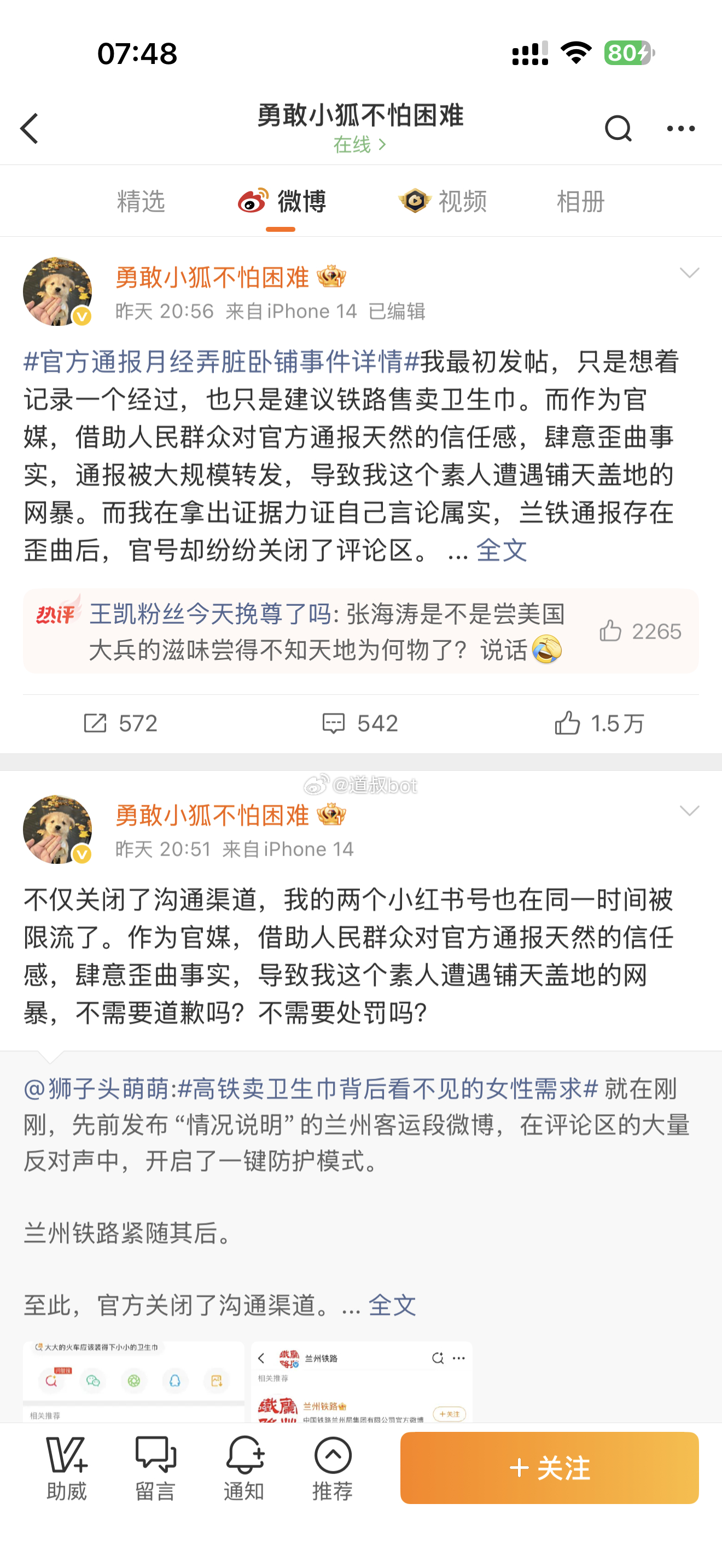 当事人以一人之力挑战官媒和兰州铁路,还有铁路科长,这已经不是简单的月经弄脏床单的小事了!看看后续怎么处理。