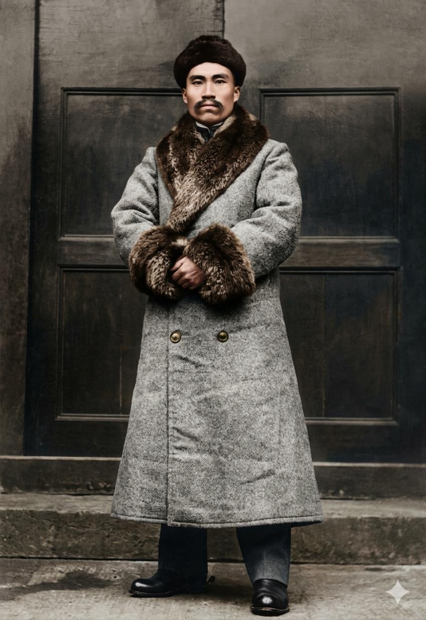这张珍贵照片记录了朱德在滇军任职时期的形象,他身着滇军高级军官冬季制式呢大衣,大衣领口、袖口镶有厚实的兽皮,头戴毛皮帽,脚蹬皮靴,留着标志性的八字胡,面容坚毅沉稳,尽显军人的英气与风骨。 这张照片大概率摄于1918–1922年间,此时朱德正担任靖国军第2军第13旅旅长,驻守四川泸州,是滇军中战功赫赫的青年将领。 1909年,朱德考入云南陆军讲武堂,加入同盟会,正式踏上革命道路;1911年参加云南“重九起义”,打响了云南反清革命的第一枪。 护国战争中,他随蔡锷入川作战,因战功升任团长;护法战争期间,他任靖国军旅长,驻守泸州,与北洋军阀作战,同时开始接触社会主义思想,对军阀混战的旧中国深感失望。 1922年,朱德毅然脱离滇军,放弃高官厚禄,远赴欧洲寻求救国真理,后加入中国共产党,完成了从旧民主主义军人到无产阶级革命家的伟大转变。