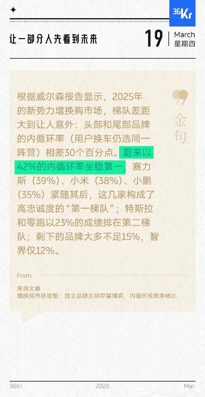 要想知道看谁更值得入手, 看看老车主怎么做。 老车主复购率高的品牌,不会差! 蔚来车主的下一台车, 大概率还是蔚来! 据尼尔森最新的数据, 2025年新势力增换购市场, 蔚来以42%的内循环率(复购率) 坐稳第一。 也是车主高忠诚度【第一梯队】的领先品牌。 赛力斯(问界)小米、小鹏 也表现不错。 蔚来的好,换电的方便只有车主懂。 这句话的含金量还在不断增加。 具体买什么,还是要看自己的需求! 符合自己的购车预算。 蔚来,特斯拉,比亚迪都是好车。 蔚来 新能源汽车 比亚迪