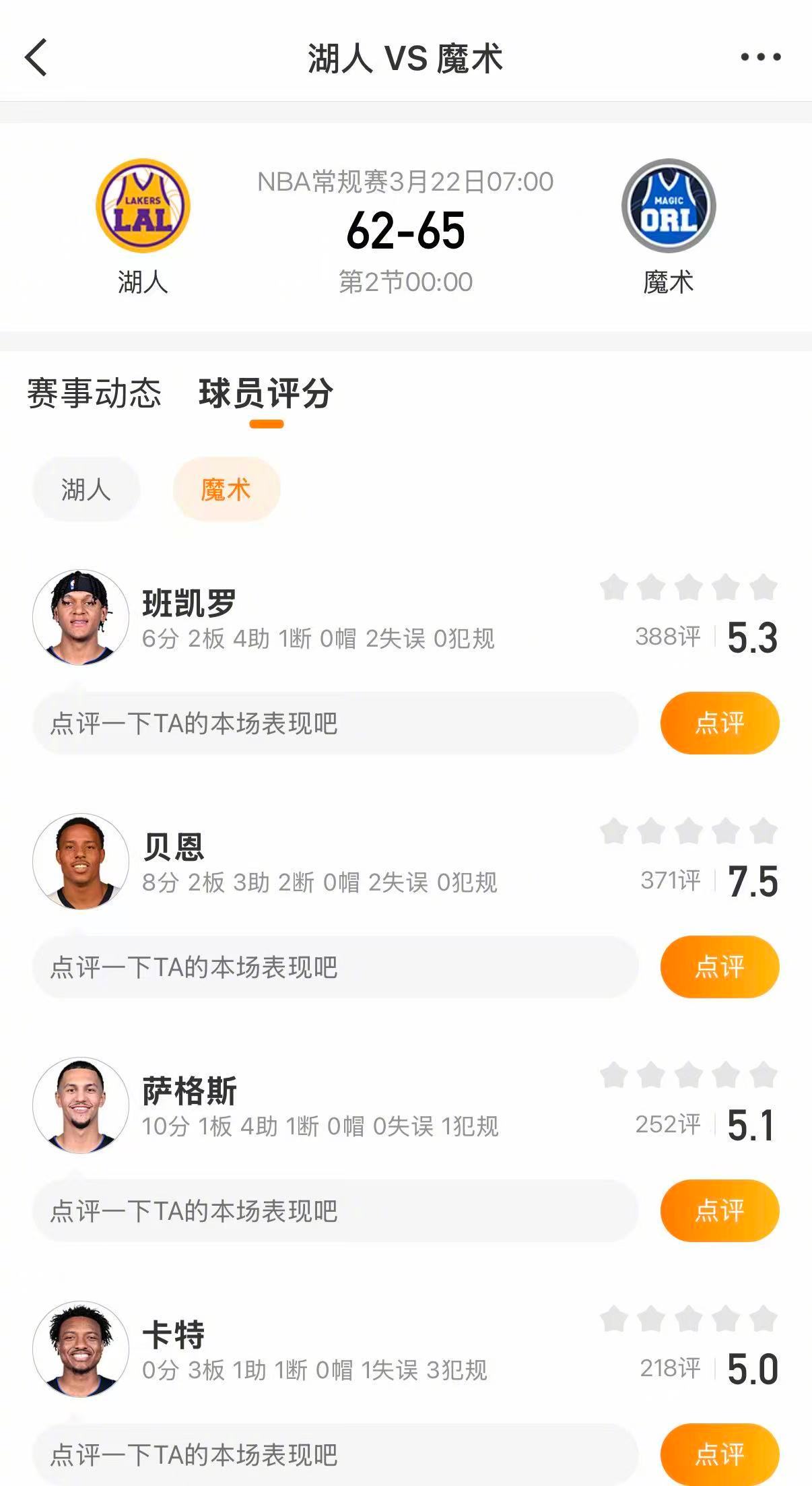 欢迎大家进入球队超话洛杉矶湖人奥兰多魔术 对球员表现进行评分!