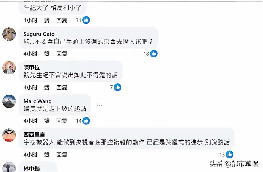 台积电董事长魏哲家说:中国机器人只会跳来跳去,没用,好看而已!这种酸葡萄心理的话一出口,没有想到怼他的不仅是大陆网民,还有大量的台湾网民。而且言辞犀利,一针见血,让这个老家伙毫无招架之力: 所以美积电也没有用,好看而已吗? 我只想说一句,说别人没用前,先做出别人能做到的。 你先做一个可以跳来跳去的看看吧…… 你(台积电)只会代工,又不是自己设计所生产的。 嘴臭就是走下坡路的起点。 年纪大了,格局却小了。 不知道魏哲家看到台湾同胞这些评论 ,会作何感想,会怎样回应。一个半截入了黄土的华人,把台湾的企业搬到美国任美国佬摆布,不知道魏哲家有什么脸面,在那里对中国高科技说三道四。 当然,在中国大陆,也有一些妄自菲薄的人跟魏哲家沆瀣一气。他们跟着魏哲家说:大陆机器人基本没有用,就是骗投资,收割股民。还有人跟魏哲家一个鼻孔出气 说,大陆机器人除了好看,真的啥用没有。还有人质疑那些怼魏哲家的评论,是小编有选择性的引用,不能代表台湾民众。说大陆机器人不过就是一个遥控玩具。 看来,台湾网民里有说大实话的,大陆网民里也有妄自菲薄,罔顾事实的。你怎么看?