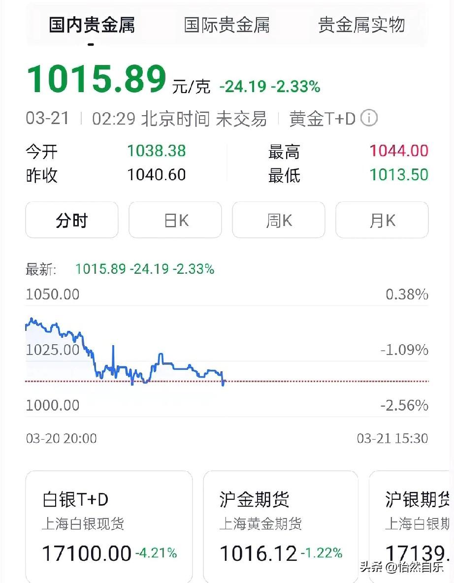 3月22日 黄金突如其来金变化, 直接让人不眨眼了。 国际金价砸到4490美元/盎司,国内T+D退回1015元,品牌金店零售价也掉到了1443到1447元一克。 这下咱们可算是看清资本的套路太深了。 美元稍微一走强,前期赚得盆满钵满的大资金,全都在赶紧抛售套现。 现在谁冲进去,大概率就是给主力接盘。 群里好几个人还在兴奋地喊“抄底机会来了”。 这种时候真得管住手。 多空博弈才刚开始,剧烈震荡能把普通人直接甩下车。 真有结婚刚需的,最好是分批慢慢看。 只要央行那边还在买,长线就还有戏。 不追高、不盲抄、不赌行情,赚自己看得懂的钱,才是最稳的。