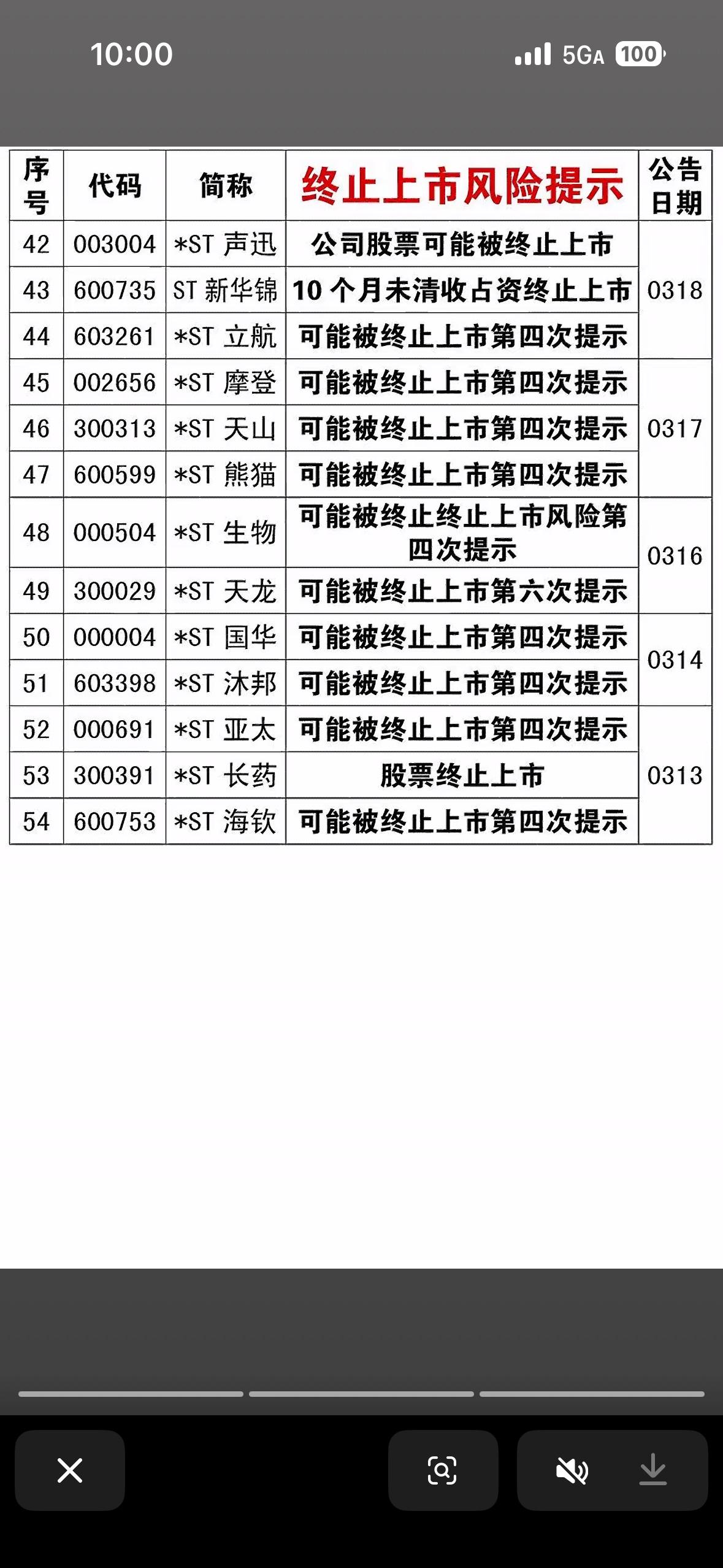 📈2026年3月13日至21日本周可能终止上市公司预警,小心投资风险!🚨 2026年3月13日至21日,有两家公司可能终止上市,投资得小心了! *ST创兴(600193)截至3月13日收盘报4.59元,总市值19.52亿元。它因财务类退市指标连续三年亏损且营收低于3亿,可能被终止上市,这已经是第三次风险提示。 还有*ST沪科(600608),3月13日收盘报3.03元,总市值9.96亿元。它2024年净利润为负且营收低于3亿,股票已被实施退市风险警示。若2025年财务指标再触及标准,就会终止上市,而且它还因信披违规被立案调查,可能面临处罚。大家投资时可得擦亮眼睛,避开这些“雷区”。