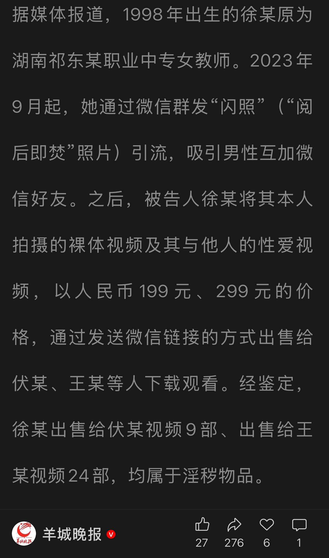 湖南95后女教师售不雅视频牟利24万,现在被判3年,罚款25万! 1998年出生的徐某,原是湖南祁东某职业中专女教师,却因贪念迷失理智,走上违法犯罪之路。 从2023年9月起,她通过微信群发“闪照”(阅后即焚照片)引流,吸引男性添加微信好友,随后以199元、299元的价格,出售自己拍摄的L体视频及与他人的不雅视频。这些内容通过微信链接供人下载观看,经鉴定,仅出售给伏某的9部视频和王某的24部视频,均属违法物品。徐某以此非法牟利24万余元,最终落网。 女教师徐某因制作、贩卖淫秽物品牟利罪,被判处有期徒刑3年,缓刑3年,并处罚金25万元。 这名女教师拍自己的不文明视频给别人看,还拍了自己与别人的不文明视频,为了钱啥事都做,这人咋这样?