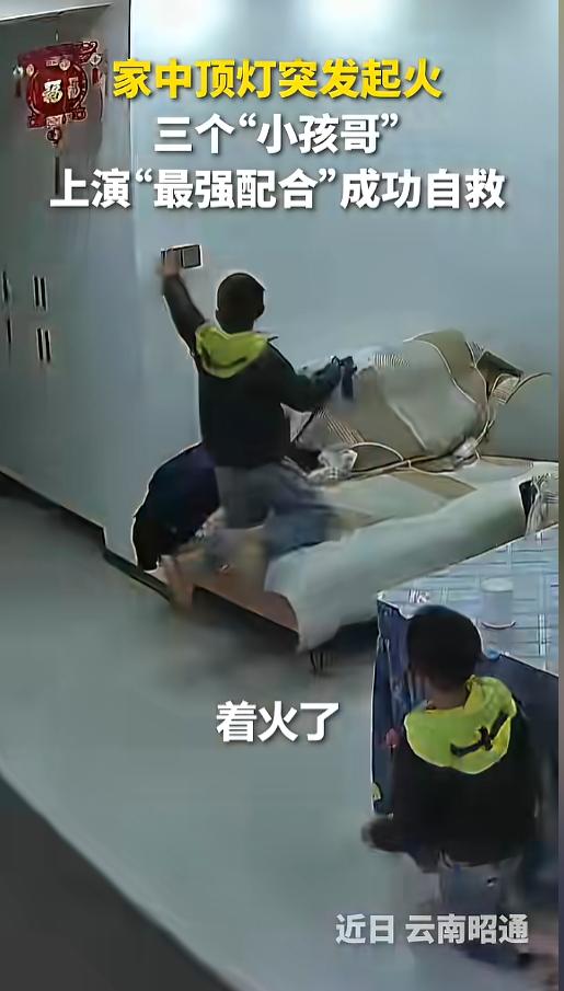 “太机智了!”近日,云南昭通,三个孩子正在客厅玩耍,突然间屋顶的灯起火了,哥哥立