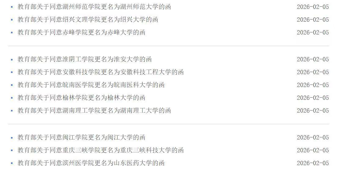 教育部一口气批复11所“新大学”!别只顾着看热闹,这背后的门道你得懂 最近,高等教育圈里传来了一个大消息,不少学子和家长的微信群都炸了锅。教育部正式发文,同意了全国9个省份的11所地方高校由“学院”升格为“大学”。这可不是简单的换个招牌、改个名字那么简单,这背后可是实打实的教育资源重新洗牌。 咱们先来看看这份沉甸甸的名单。此次“升级”涉及浙江、内蒙古、江苏、安徽、陕西、湖南、福建、重庆、山东等9个省份,而且这11所高校清一色都是公办本科院校。 具体到学校,那可是各有千秋。浙江省这次成了大赢家,一口气多了两所“大学”:湖州师范学院正式更名为湖州师范大学,绍兴文理学院也如愿以偿更名为绍兴大学。江苏的淮阴工学院更名为淮安大学,听这名字,地域归属感瞬间拉满。安徽也是双喜临门,安徽科技学院更名为安徽科技工程大学,皖南医学院更名为皖南医科大学。此外,还有赤峰学院更名为赤峰大学,榆林学院、泉州师范学院、湖南理工学院、重庆科技学院、滨州医学院等也都在此次名单之列,部分高校甚至已经完成了揭牌更名仪式。 消息一出,网上的评论区那是相当热闹。有人调侃:“武大什么时候降级?”这显然是句玩笑话,但也侧面反映了大家对高校头衔的敏感度。还有河南网友调侃:“都不用看,肯定没河南”,这种失落感也折射出各地对优质高等教育资源的渴望。 当然,最扎心的评论莫过于这一条:“除了名字变化,还有其他变化吗?” 这话问到点子上了。在很多人的印象里,学院变大学,似乎就是改个名、换个章。其实不然,教育部对“学院”和“大学”的设置标准有着严格的硬杠杠。从在校生规模、师资队伍中的正副教授比例,到硕士点数量、科研经费、占地面积,甚至图书馆藏书量,都有着量级的差别。 简单说,能从“学院”升格为“大学”,意味着这所学校的办学规模扩大了,学科建设更完善了,师资力量更强了。对于学生来说,最直接的好处就是毕业证上的含金量变高了,考研深造的平台更宽了,甚至未来的就业门槛都能跟着沾光。毕竟在当下的招聘市场上,“大学毕业”和“学院毕业”,在某些HR眼里还是有些微妙区别的。 更重要的是,这次更名的大多是地方性高校。比如赤峰大学、湖州师范大学、淮安大学,它们的升格,意味着当地省市一级政府对高等教育的投入见到了实效。这些学校往往承担着为地方经济发展输送人才的重任,学校档次上去了,能留住的人才自然也就多了。 不过,咱们也得泼盆冷水。名字好听了,并不意味着就可以躺在功劳簿上睡觉。真正的“大学”之大,不在于大楼之高,而在于大师之多,在于学风之正。对于这些新晋的“大学”来说,更名只是万里长征的第一步,如何从“名至”做到“实归”,提升教学质量,才是接下来要面临的大考。 对于今年的高考生来说,这无疑是个利好消息。填报志愿时,这些学校刚刚升格,录取分数线可能还没完全反应过来,趁着这波红利期“上车”,没准就是个性价比极高的选择。当然,选学校不能光看名头,还得看专业实力,毕竟适合自己才是最好的。 以上内容仅供参考和借鉴