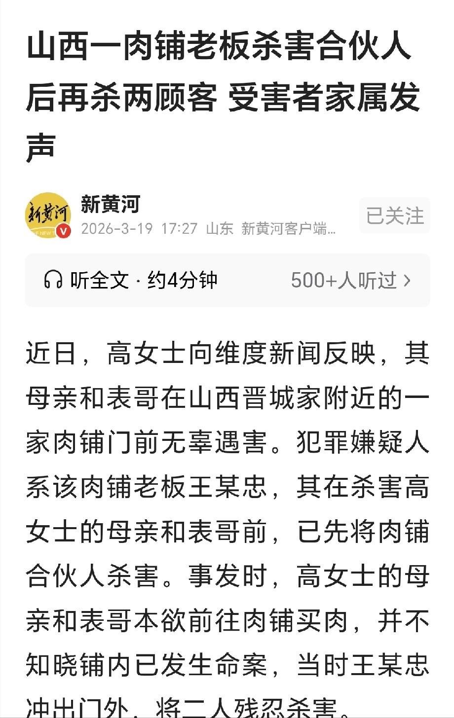 “太可怕了!”山西晋城,一男子开肉铺,合伙人妻子患了癌症,因为要照顾妻子,合伙人想退出店铺,可男子女儿要结婚,他也忙碌,不同意合伙人退出店铺,可是等他忙完,他又要求合伙人退出,合伙人不同意了,给妻子看病,已经花完了积蓄,他要继续留下经营店铺,男子急了,拿了把刀把合伙人杀死,这时,肉铺进来一男一女两位客户,男子冲出肉铺,一刀将男客户杀死,又噗噗几刀,将女客户杀死,家属赶来,悲痛欲绝,我们与他无冤无仇,不知他为何下此毒手? 事情发生在晋城一条再普通不过的街道上,那天下午,附近商铺照常营业,一家肉铺的卷帘门半开着,店里有切肉的声音,也有油烟味往外飘,看不出任何异常。 李某生刚吃完午饭,是妻子秦某从家里送过来的,两个人之间没有太多交流,这种日常已经持续很多年,彼此一个眼神就能明白对方在想什么,秦某把饭盒收拾好,简单说了几句,就回家了。 她刚进家门没多久,外面突然有人喊,说店里出事了,她来不及多想,立刻往回跑,等她赶到门口的时候,已经看到李某生倒在地上,整个人当场崩溃。 动手的人是王某忠,两人一起经营这家肉铺已经有二十多年,平时分工明确,收入也按约定分配,虽然偶尔有分歧,但大体还能维持,这样的合作关系,在小生意里,算是比较稳定的。 矛盾真正激化是在前一年,秦某被查出患病,需要长期治疗,家庭支出一下子增加,李某生提出想退出生意,一方面是腾出时间照顾家人,另一方面也希望能把资金拿出来应急。 但王某忠当时也有自己的难处,比如家里有大额支出,需要人手维持店铺运转,所以没有同意,他希望对方再坚持一段时间。 事情就这么拖了下来,后来等王某忠这边的压力稍微缓解,他反而希望李某生尽快退出,但这时候对方已经没有条件离开了,治疗费用、家庭开销,都让李某生不得不继续留在店里。 两个人的立场发生了变化,矛盾也越来越明显,表面上还是一起干活,实际上心里都有情绪,只是一直没有彻底爆发。 事发当天,店里照常营业,王某忠手里拿着平时用来处理肉的刀,在店内活动,这在这种环境里很常见,没有引起特别注意。 等秦某离开后不久,冲突突然发生,具体经过很短暂,李某生当场受伤倒地。 就在这时,两名路过的顾客走到店门口,是来买肉的普通人,一位年纪较大,一位是家里的主要劳动力,他们和店里的人并不认识,也不了解里面刚发生了什么。 王某忠从店内出来,对两人进行了攻击,事情发生得很快,几乎没有反应时间,短短几分钟内,现场已经出现多名伤亡。 随后,周围群众和相关人员迅速介入,王某忠被控制,案件进入处理程序。 这起事件带来的影响,不仅在现场,受害者家属的生活,也随之发生巨大变化,有的家庭失去了主要经济来源,有的老人失去了依靠,原本正常的生活被打断。 对秦某来说,情况更加复杂,丈夫去世后,她还要面对自身的健康问题以及经济压力,处境十分困难。 从法律角度看,这类行为已经触及刑法中关于故意杀人的规定,后续处理会按照相关程序进行。 回头看整件事,起因并不复杂,是合作关系中的分歧逐渐积累,没有及时化解,最终走向失控,但结果却非常严重,波及到原本毫不相关的人。 类似情况也提醒人们,在长期合作或生活中,一旦矛盾持续存在,及时沟通和处理非常重要,如果情绪长期积压,可能在某个瞬间被放大,带来难以承受的后果。 对无辜者来说,他们只是正常生活中的普通一环,却在不合适的时间,出现在不合适的地点,成为事件的受害者,这种偶然性,也是此类事件中,最让人难以接受的一点。