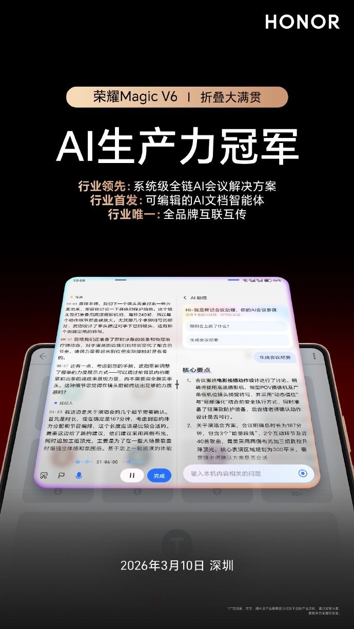 谁懂呀,谢霆锋演唱会现场粉丝淡定开会,这职场大姐直接把打工人追星天花板玩明白了!荣耀Magic V6在手,不管演唱会现场多嗨多吵,都能精准完成会议语音实时转写,智能提炼核心要点,自动生成完整会议纪要,连待办事项都给你梳理到位,甚至多语言会议都能实时翻译,直接把专属职场助手揣进兜里。真正实现年轻人的一心二用有多绝,从此以后追星自由,让工作和生活更平衡!这波硬核操作,不得不服!