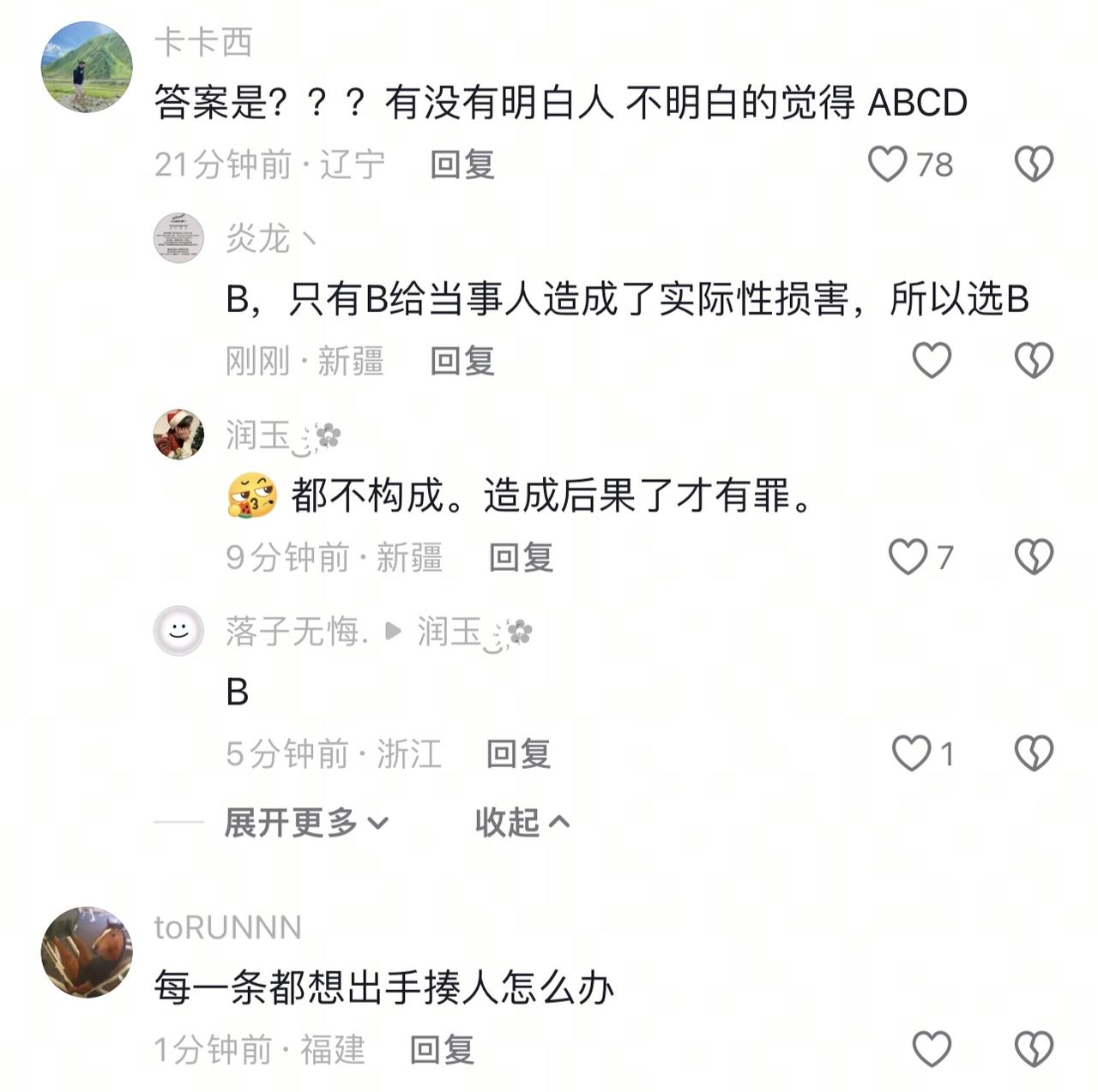 不得不说,法学院的课确实有点离谱。这道题换做是谁,怕是都不知道怎么选了吧。反正是我选的话,肯定abcd我都认为是。但是在评论区里很多网友说答案是b,因为只有b给人造成了实质性的伤害,而acd选项没有造成实质性的伤害,只是说道德问题。 不知道有没有专门学法律的来给大家进行一下科普。但我是感觉现实中应该没什么人会干这种事情,因为你干这种事情的话,大概率会被人打。还有就是如果真有人干这种事,被别人打了的话,那么打他的人要不要承担法律责任呢? 但不得不说,如今寻衅滋事被纳入的范围很广了。这也说明我们的法律在不断的完善。可以说这其实也是件非常好的事。