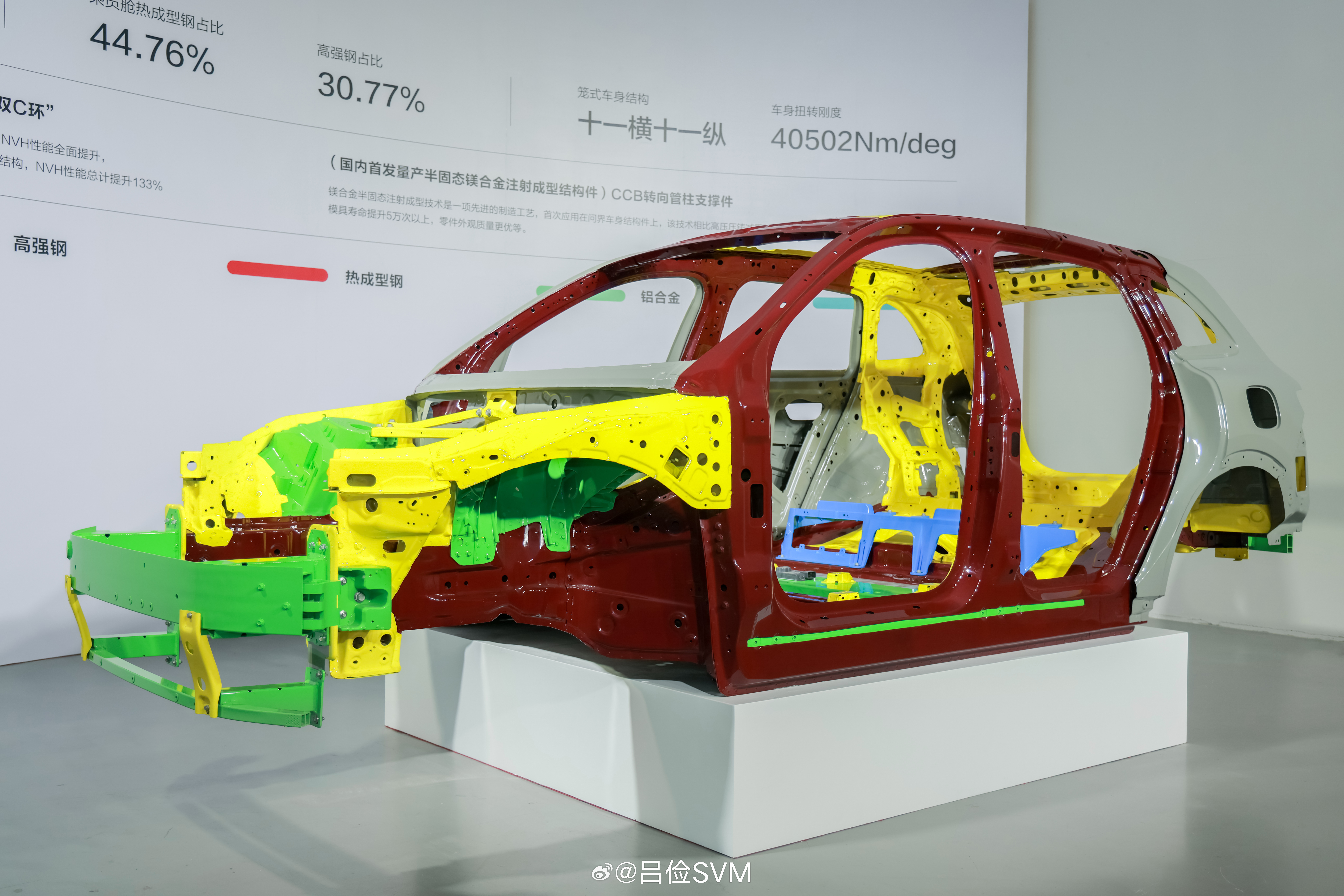 除了成本高外,还因为热成型钢不好焊接,精度控制很困难。沃尔沃XC90热成型钢在33%持续了好久上不去,直到为了推出旗舰大作EX90才把热成型钢推到40%。而问界M6硬是加到了40.81%。