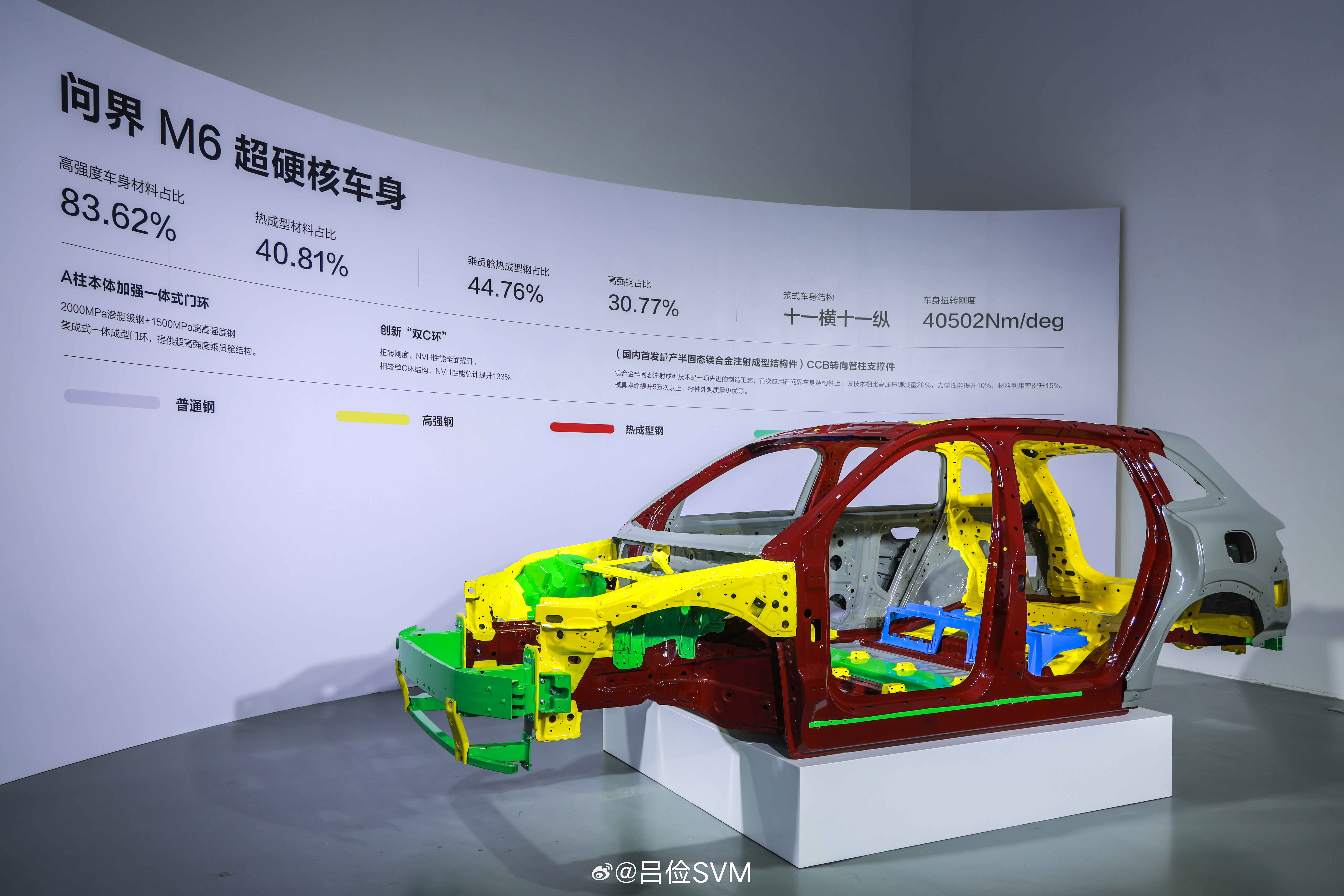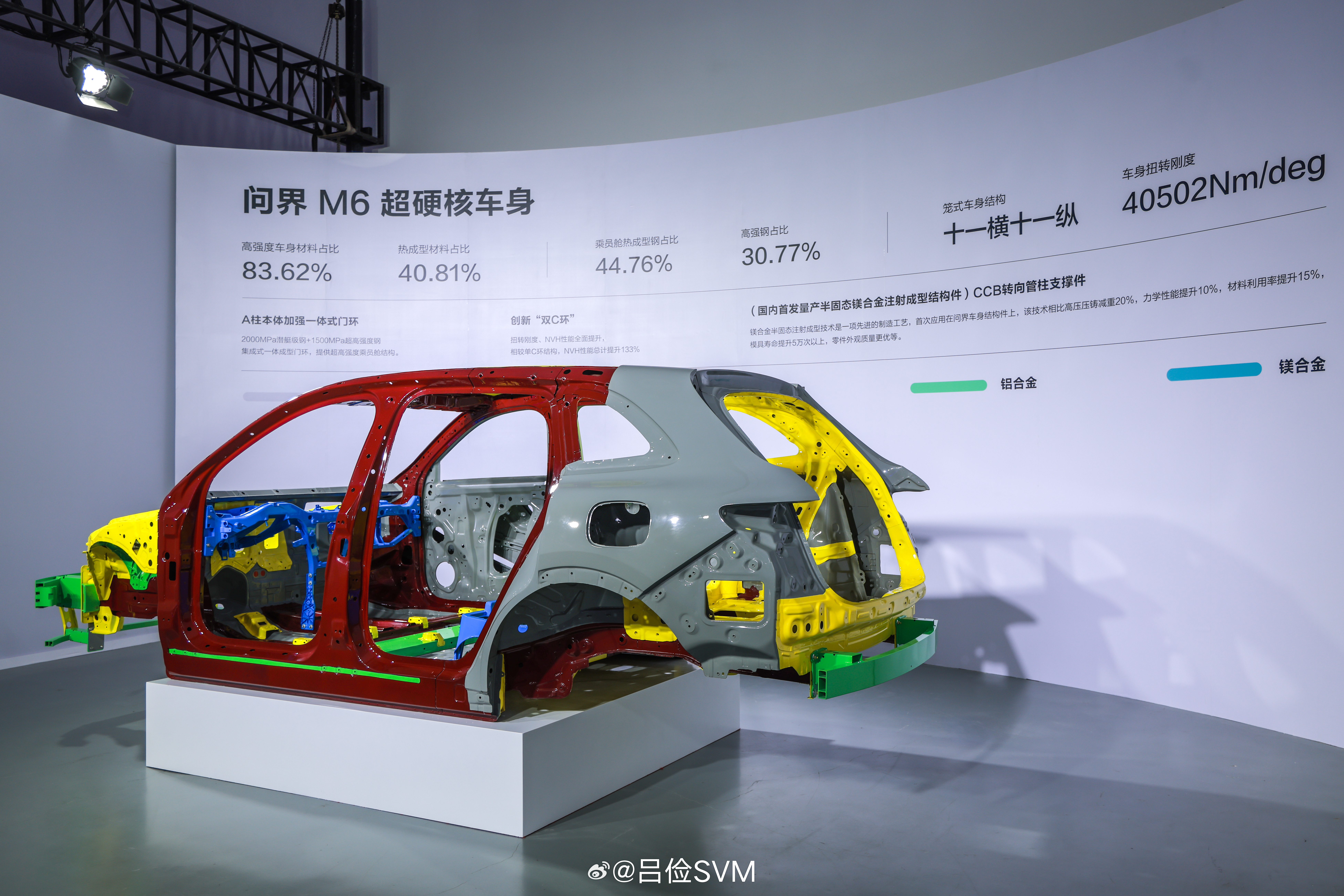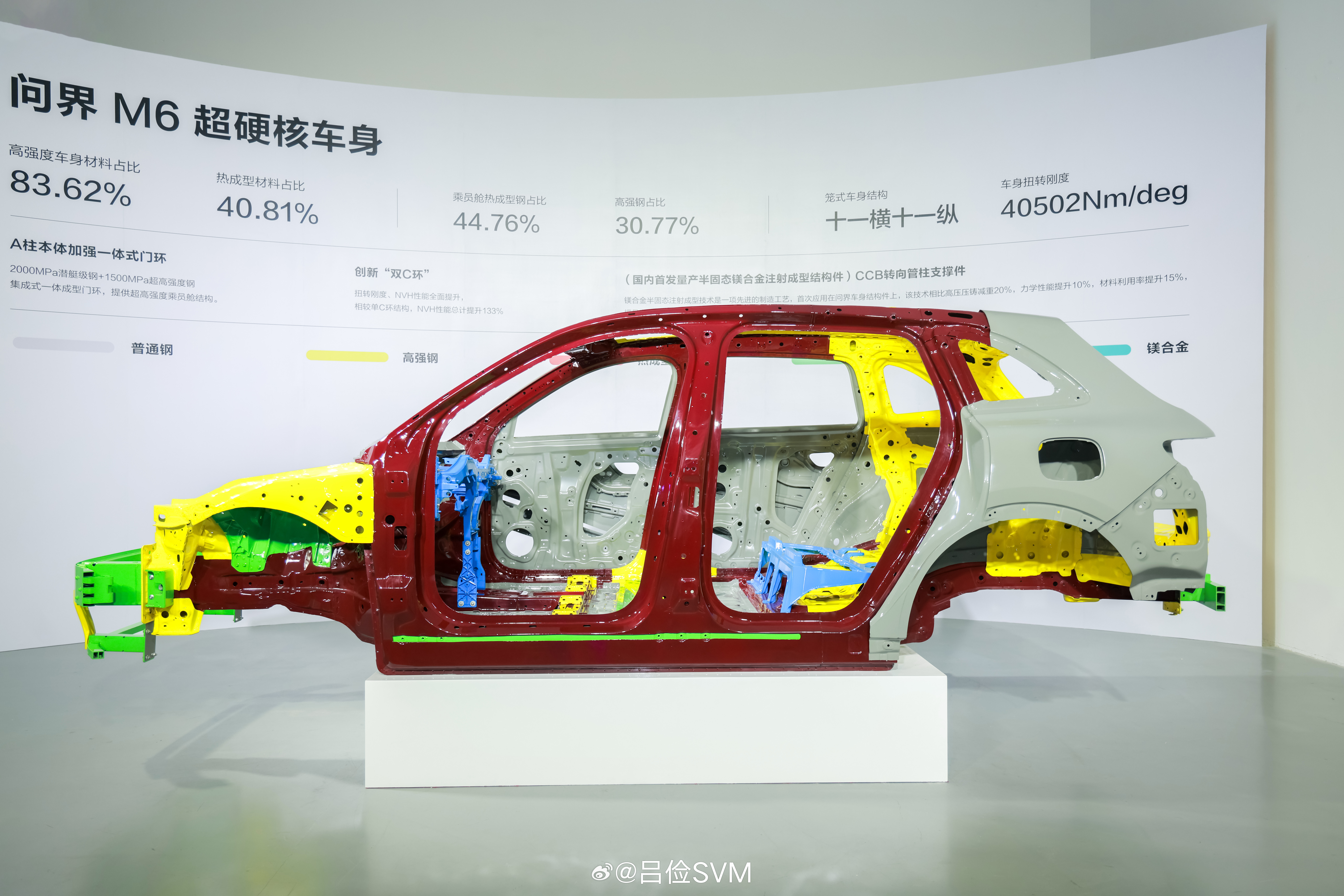 问界M6静态评测首发华为春季全场景新品发布会我有想过问界M6可以推很多智能科技,但讲实话,我很难想象这台车竟然连白车身都想要再加大创新。我甚至有些怀疑,问界M6的白车身研发难度和成本要和电池包看齐。