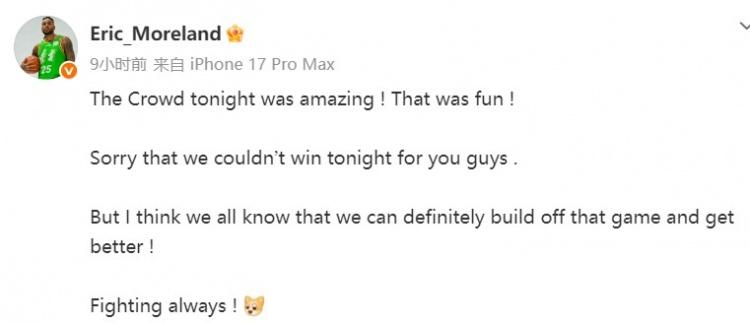 CBA最新消息:据辽宁男篮球员莫兰德在社媒上向球迷们道歉:“今晚的观众们太棒了!这很有趣!“抱歉我们没能为你们赢下今晚的比赛。“但是我认为我们都知道我们肯定能从这场比赛中进步、变得更好。“战斗不止!”其实整场比赛不怪任何人,首先莫兰德已经表现的很好了,同对位的明星中锋麦基只有6分3板。也不怪外线,赵继伟也已经表现的很好了,只能说北京男篮两个国家队级别的后卫个人实力太强了。赵睿拿了34分,陈盈俊末节直接暴走,辽宁男篮不要灰心,一旦等哈维和布罗金顿适应CBA节奏,辽宁男篮还是有机会的。