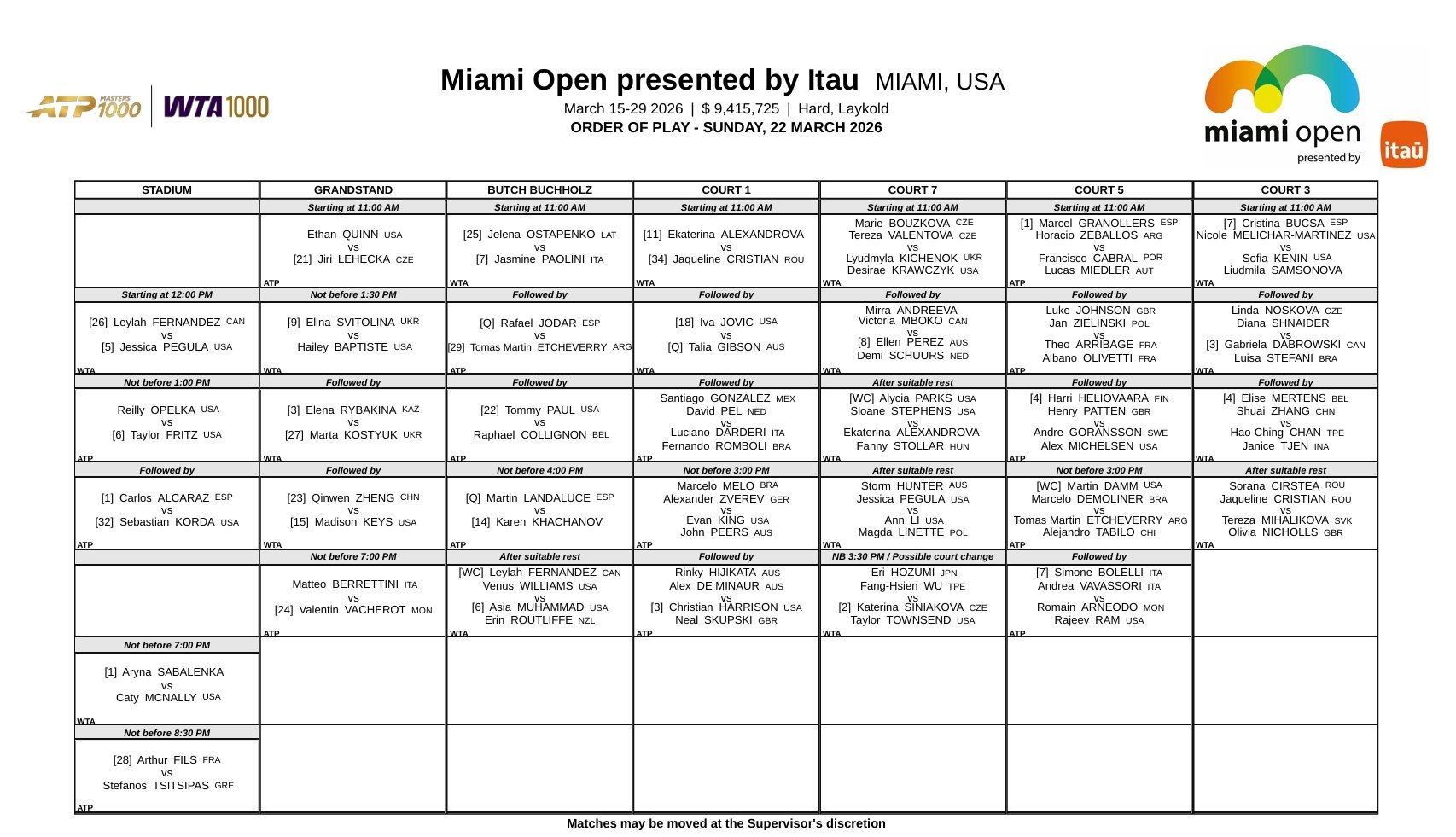 WTA1000迈阿密站第六日赛程📅