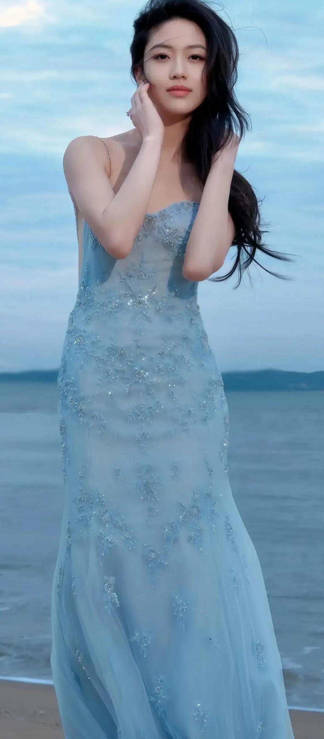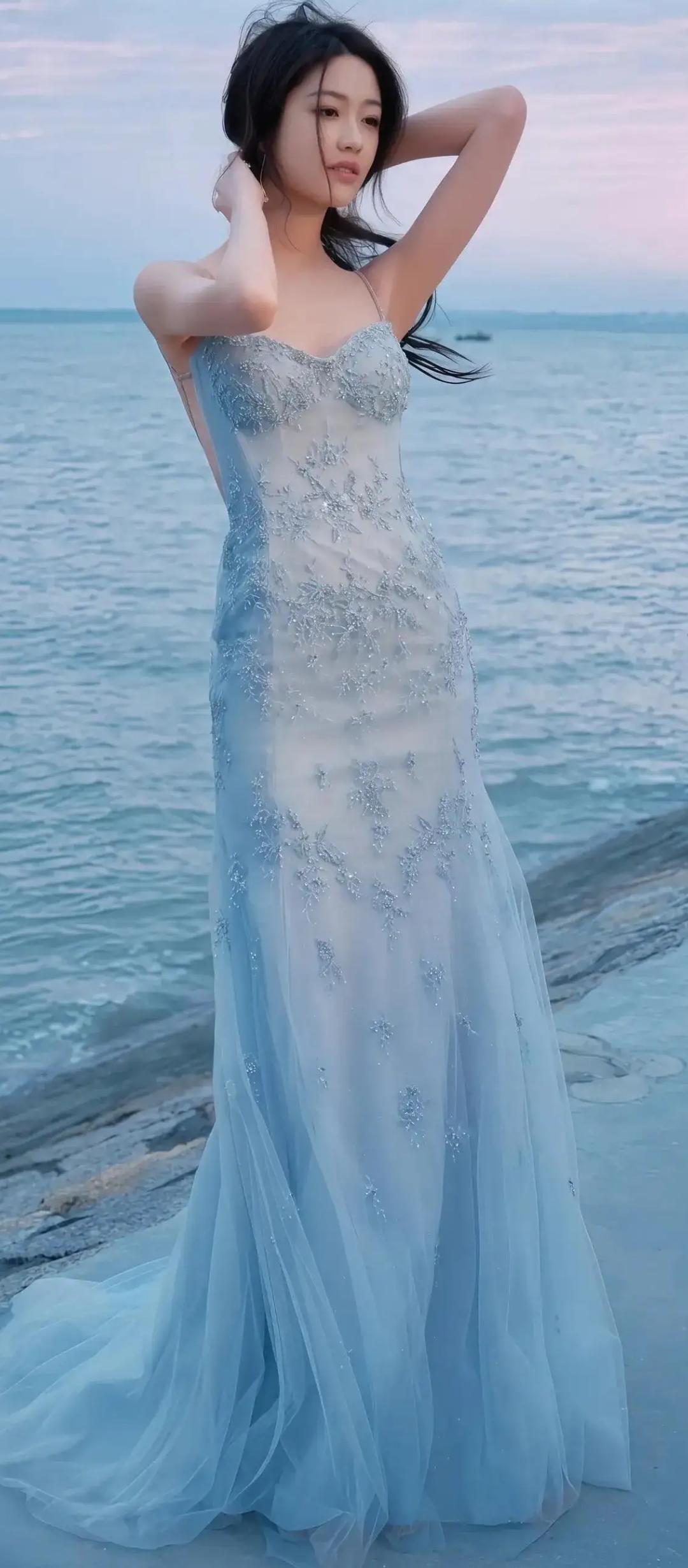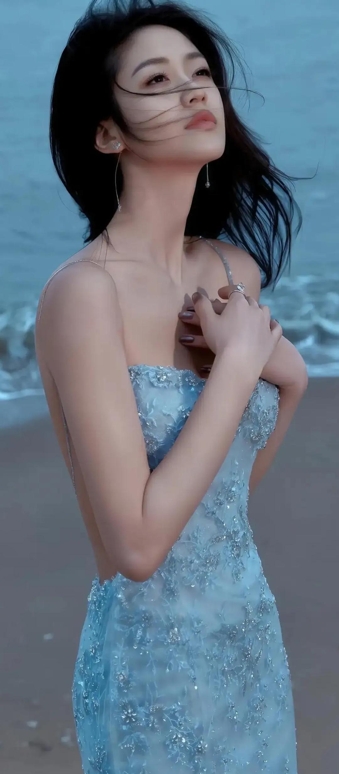 海边漫步,轻纱裙摆随风飘逸,宛如仙子下凡。