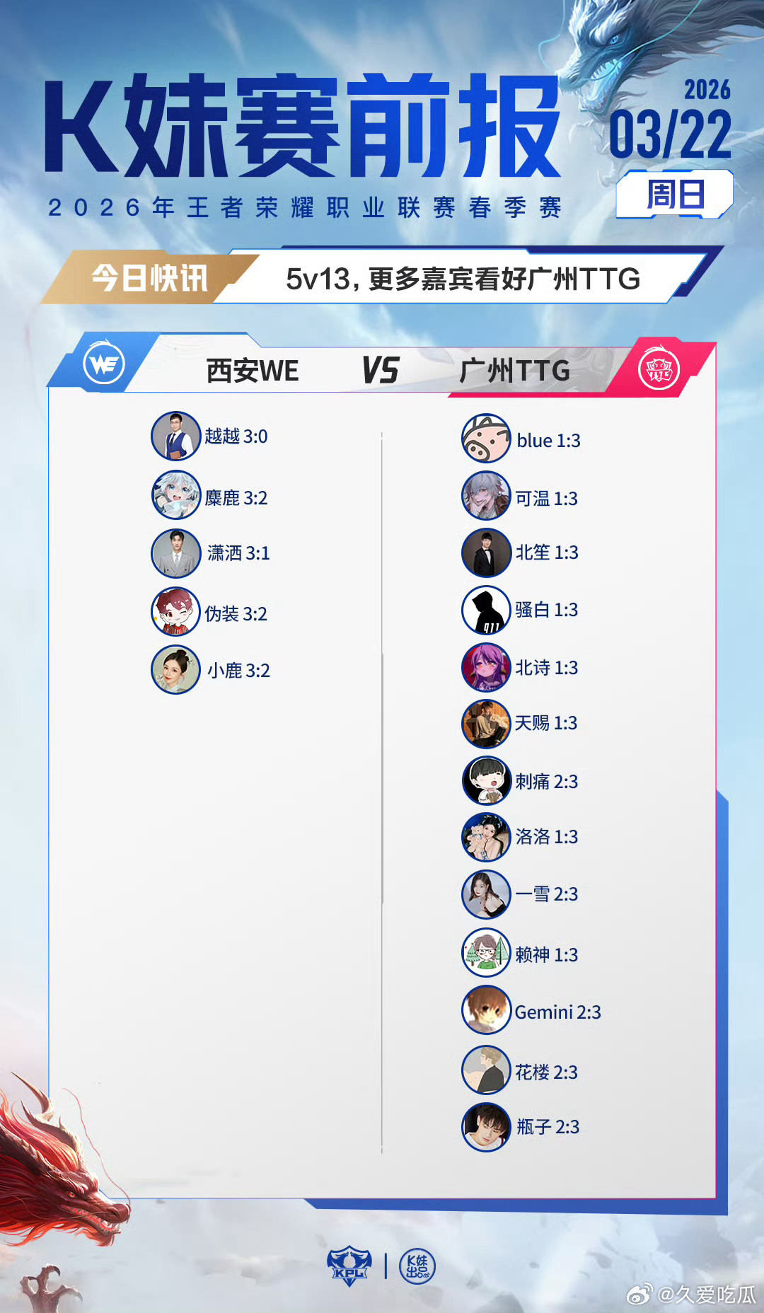 2026KPL春季赛|K妹赛前报blue1v17力挺长沙TES.A;无老师登场,