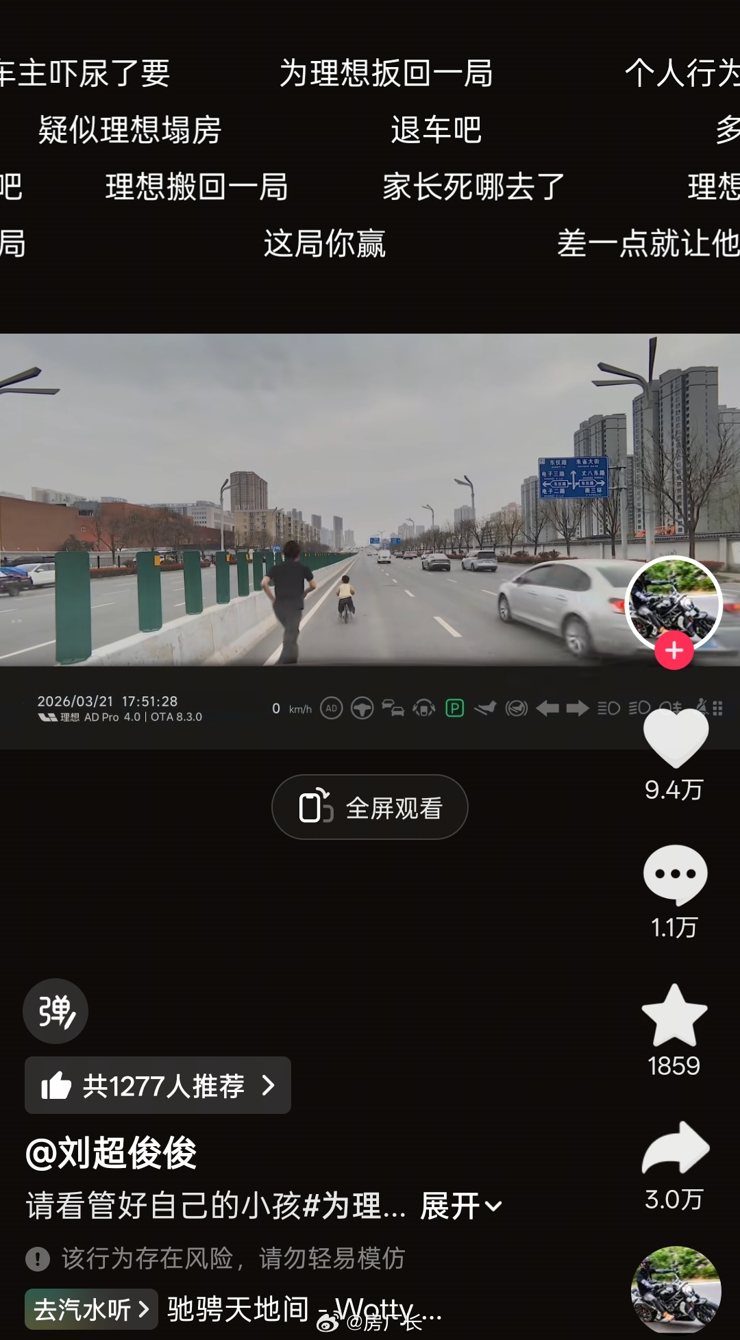 理想车主又做好事了,救下一位在公路乱骑乱闯的小朋友,李想准备好请车主吃什么了吗