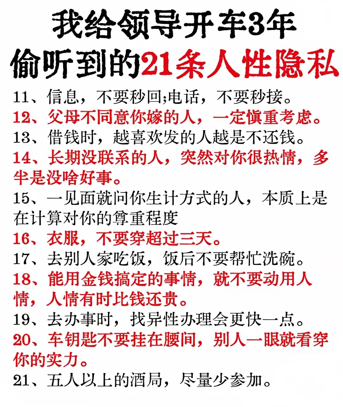 给领导当司机3年了,听了太多人情世故,今天把这21条人性隐私扒出来,每一条都能戳中成年人的痛点,看懂的人都少走10年弯路!这些话虽然听着糙,但都是过来人的经验,没什么大道理,就是教你怎么在社会上少吃亏。