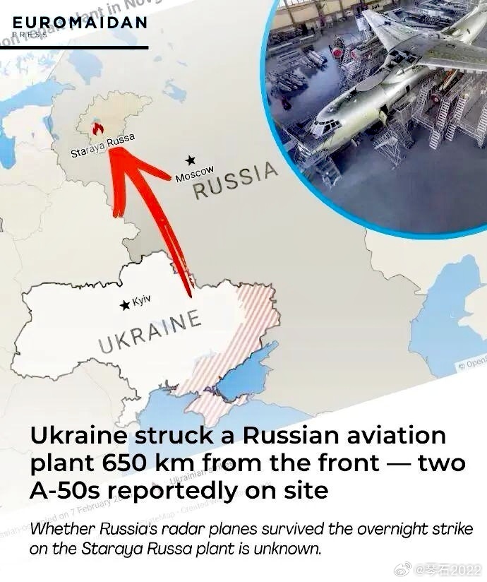 就4架A50U了?3月17日乌军出动无人机深入俄罗斯腹地,对俄空天军本就所剩无几的A50U预警机实施打击,并造成其中一架受损。若此次受损情况严重,那么俄军现役可飞行的A50U数量将降至4架,这将导致俄军无法对乌克兰空域的全天候监控。此次遇袭的预警机,是俄军现存5架可执行任务的A50U之一,正在距俄乌边境630km的诺夫哥罗德州斯塔拉亚鲁萨第123航空修理厂。🦑声称无人机击穿修理厂大型机库的顶部,该机“受损情况已得到确认”。🔸2023年2月,乌军无人机在白俄罗斯境内击伤一架地面停放的A50U。🔸2024年1月,乌军爱国者在乌克兰南部亚速海上空击落一架A50U。这是全球首架被击落的预警机。🔸2024年2月,乌军S200导弹在同一区域击落第3架空中飞行的A50U。目前俄军可能就4架老A50U了,技术水准可能还不如美国佬的E3A,美国佬还可以调海军E2D来补。现在乌克兰2架Sab340预警机到位网页链接,俄军应该有点麻烦了…