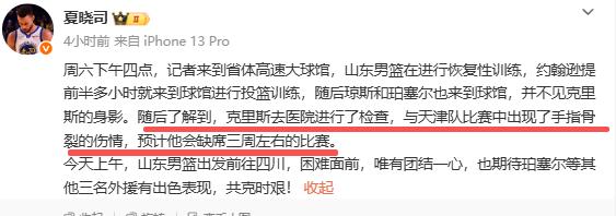 晴天霹雳!山东记者确认山东男篮大外援常规赛报销。没错,他就是克里斯。据山东记者 夏晓司报道,周六下午四点,山东男篮在进行恢复性训练,多名外援提前半多小时就来到球馆进行投篮训练,但是并不见克里斯的身影。随后了解到,克里斯去医院进行了检查,与天津队比赛中出现了手指骨裂的伤情,预计他会缺席三周左右的比赛。骨裂恢复周期长,有可能常规赛报销了。 克里斯是山东队的第一外援,场均得20.6分8板,是球队得分王,如果他打不了比赛,那对山东队真的损失太大了。目前山东队排名第四,极有可能因为克里斯常规赛报销,排名可能会掉到八强以外。希望克里斯尽早康复,也希望山东队共克时艰。加油!