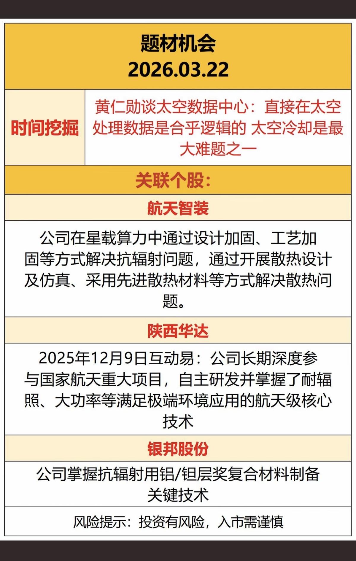 算力———太空冷却 概念! 黄仁勋谈太空数据中心:直接在太空处理数据是合乎逻辑的,但难点是太空冷却。 相关核心龙头关联股: