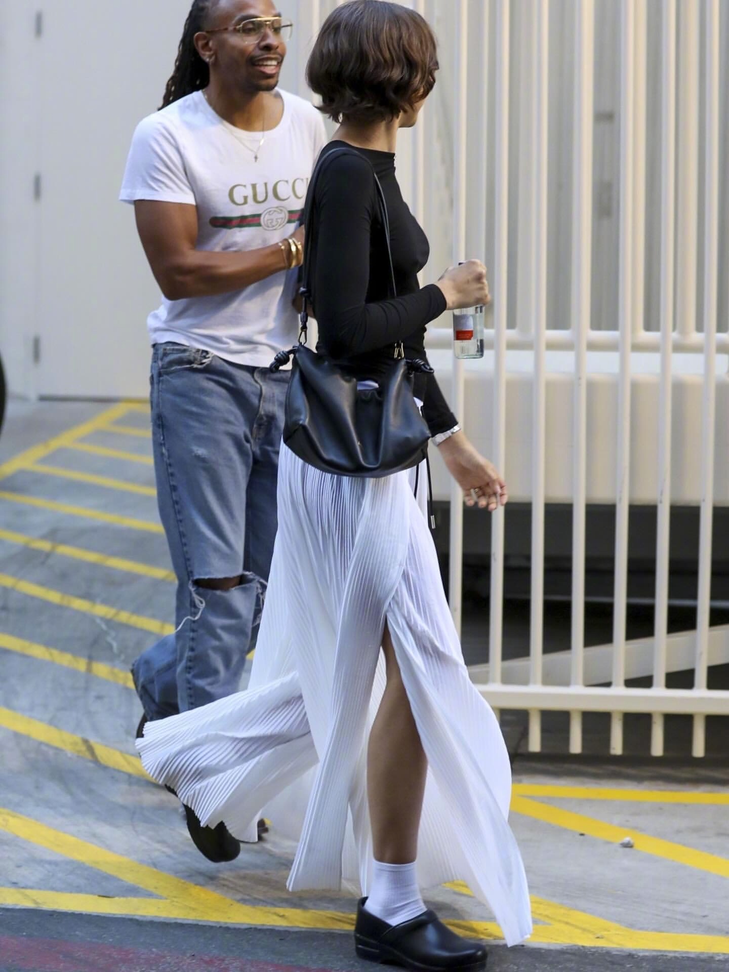 新婚的赞达亚和荷兰弟婚周五晚现身洛杉矶外出吃饭的街拍。 赞达亚一身黑白配,脚穿Dansko 木屐鞋,肩背Loewe 羊皮手袋,佩戴Jessica McCormack婚戒和钻戒。米拉服饰解析