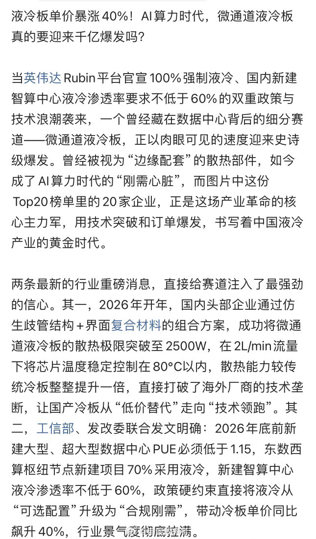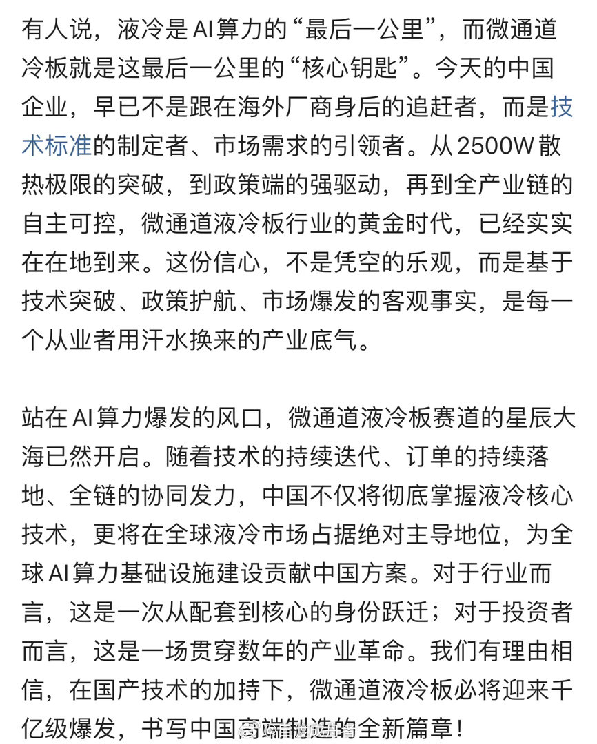 逐玉反盗版声明 AI芯片功耗不断攀升,如英伟达Rubin架构单芯片功耗直冲2300W,风冷技术已达散热极限,而微通道液冷板凭借高效散热能力,可将芯片温度稳定控制在合理范围,如国内企业通过技术创新,能在2L/min流量下将2000W-2300W芯片温度控在80多摄氏度以内,散热能力远超传统冷板,成为AI算力时代散热的关键技术,其在液冷系统中的核心地位愈发重要。