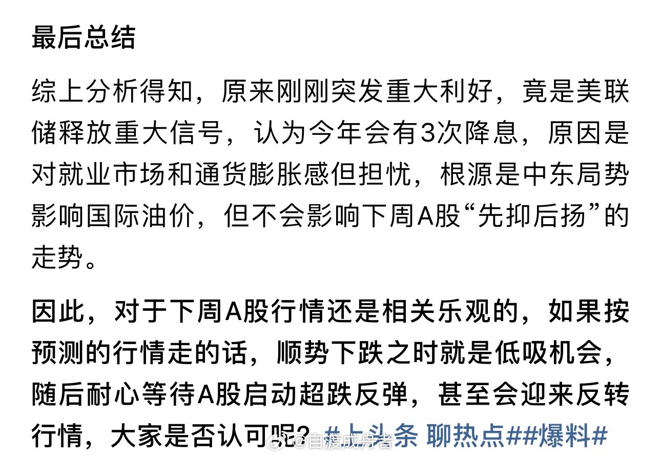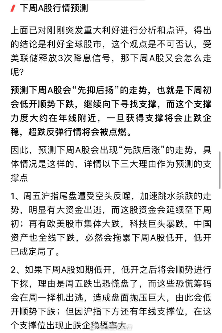 受美联储可能有3次降息这一利好影响,下周A股行情有望先抑后扬