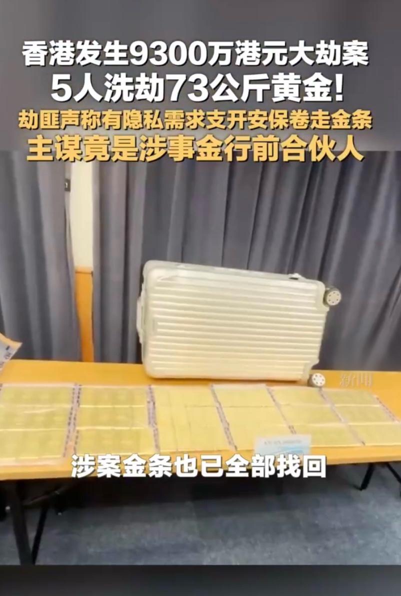 香港发生9300万港元黄金大劫案 黄金抢窃案 3月20日,香港一金行遭劫:一男子假扮买家,以“需隐私”支开安保,3名同伙随即闯入,以“老板欠债”为借口,将73公斤、价值9300万港元金条装箱抢走,1人在外放风,5人分乘两车逃离。 警方次日通报,5名嫌疑人已全部抓获,涉案金条悉数追回。经查,团伙主谋为该金行前合伙人,系熟人精心策划作案。