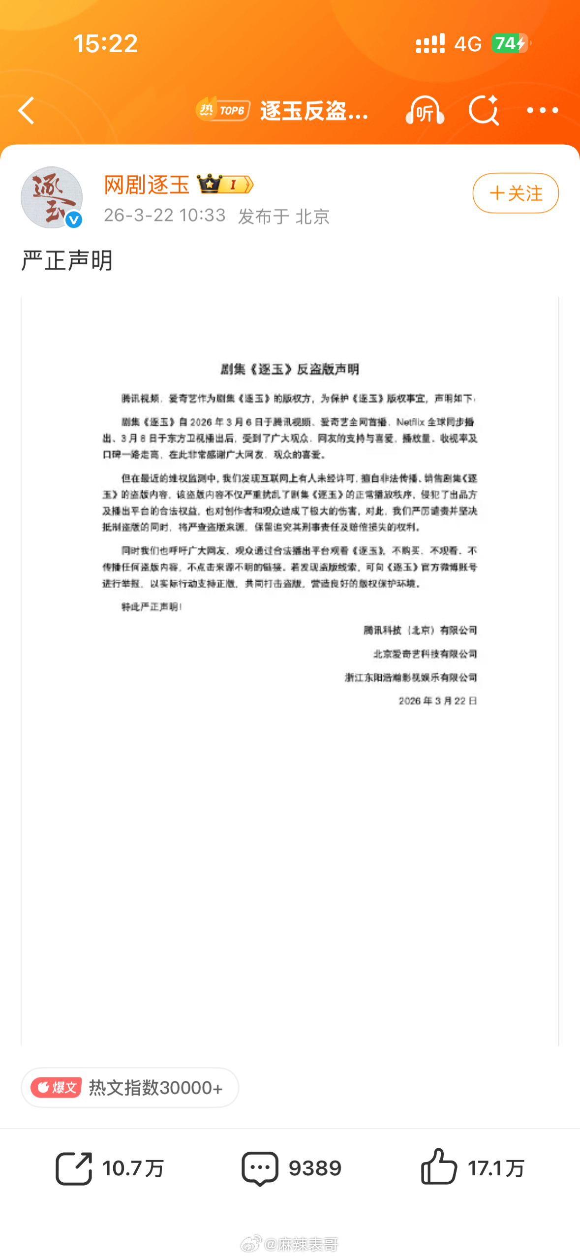 逐玉发了反盗声明,呼吁大家支持正版那不是粉丝看的进度还没有路人看的进度快了