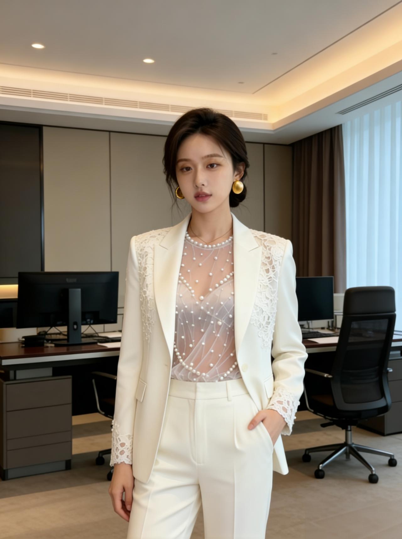 一件剪裁利落的白色西装外套, 衣身点缀精致的蕾丝花纹, 既显专业又添优雅细节。 上班穿这身,太美了! 你喜欢吗?