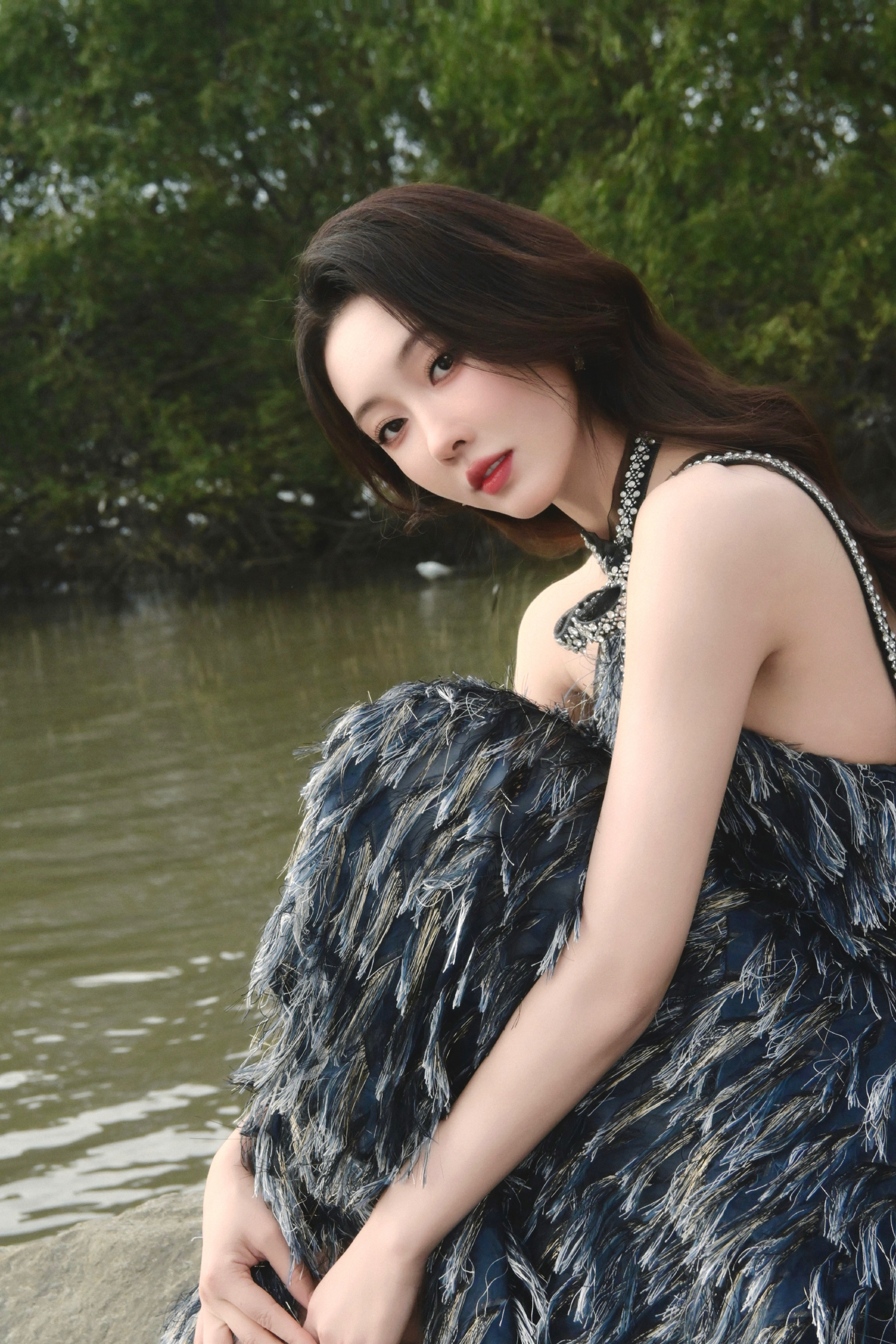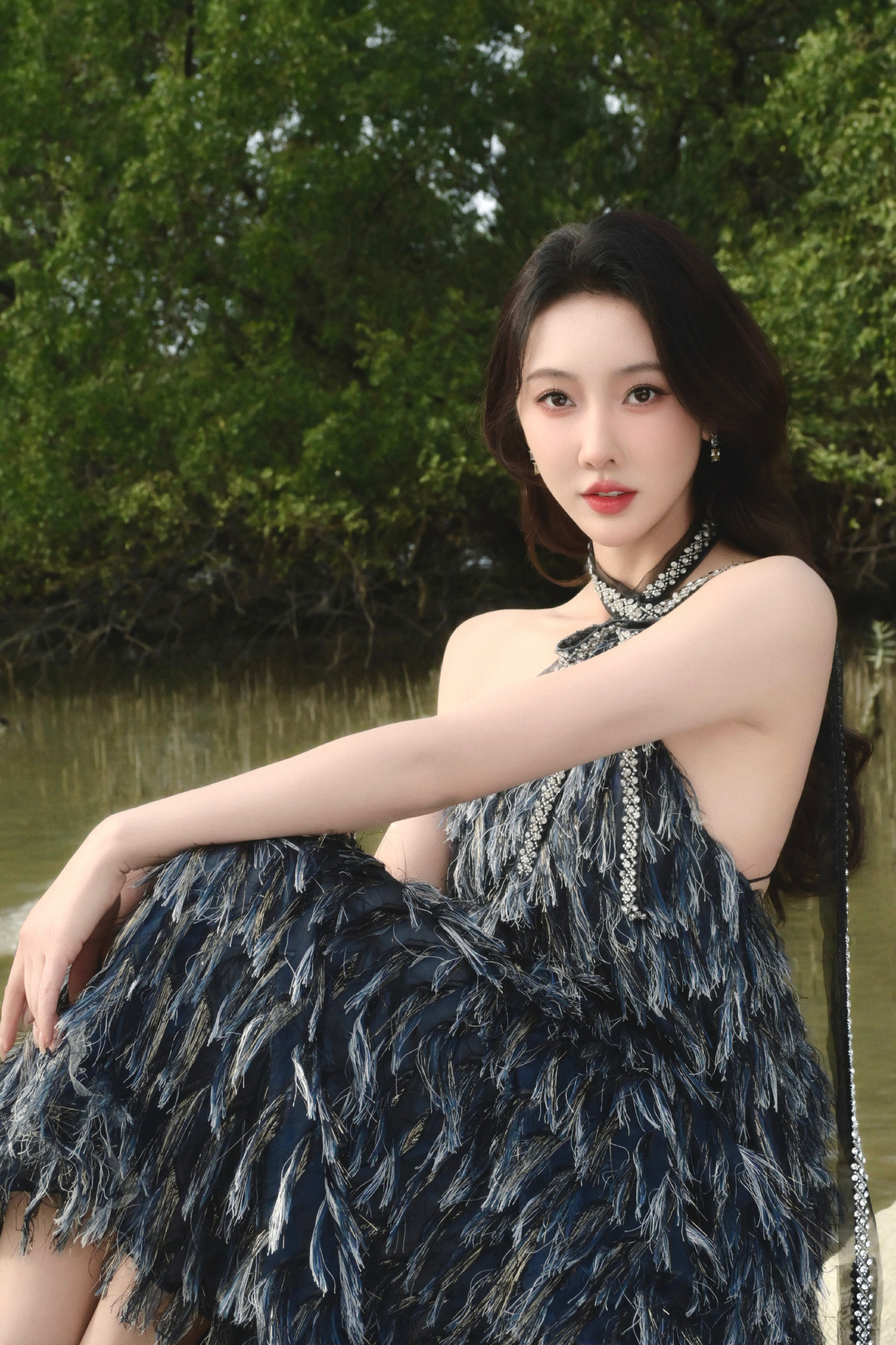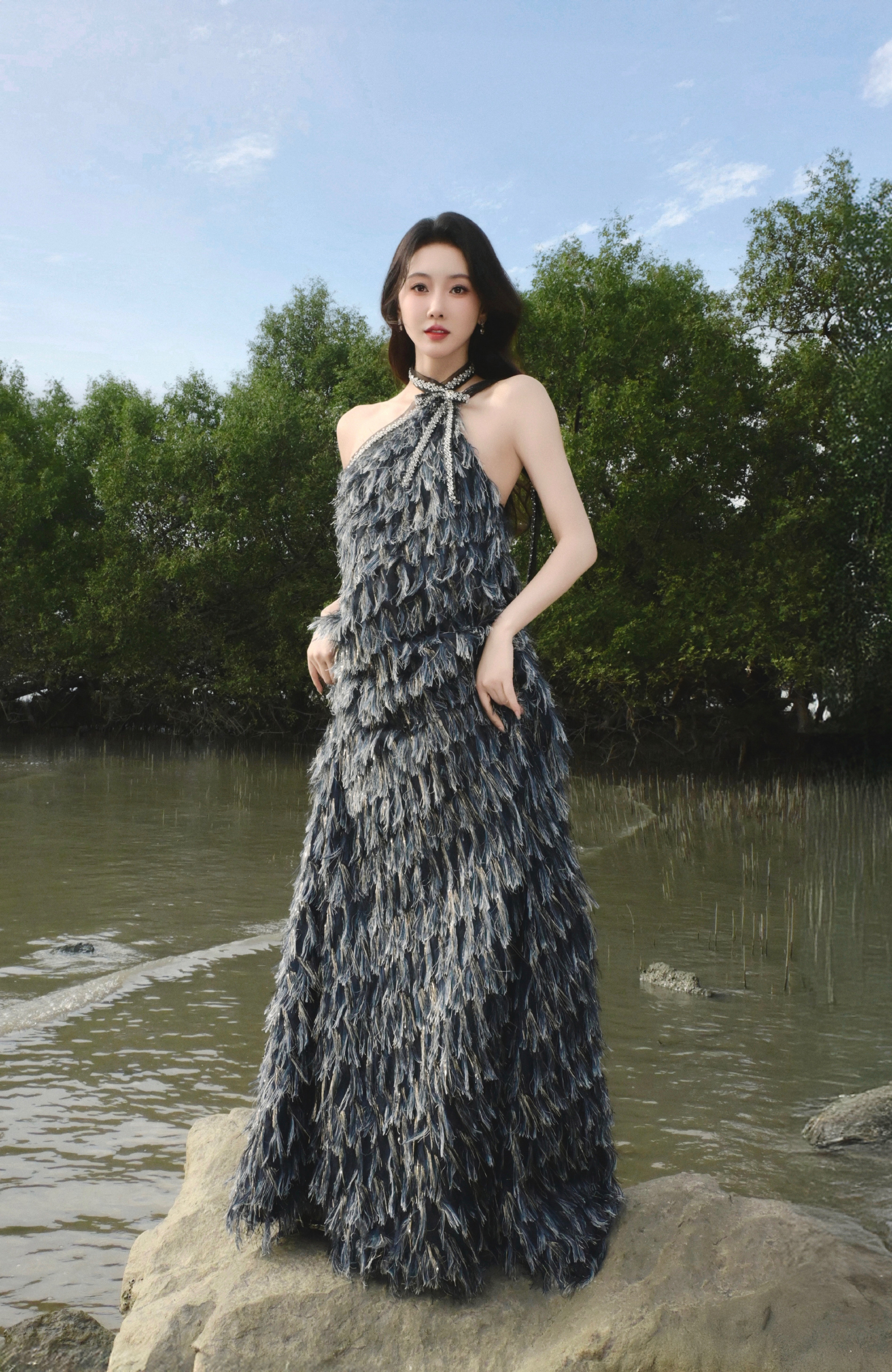 宣璐春日穿搭:穿挂脖羽毛裙的”原野小仙女“。宣璐