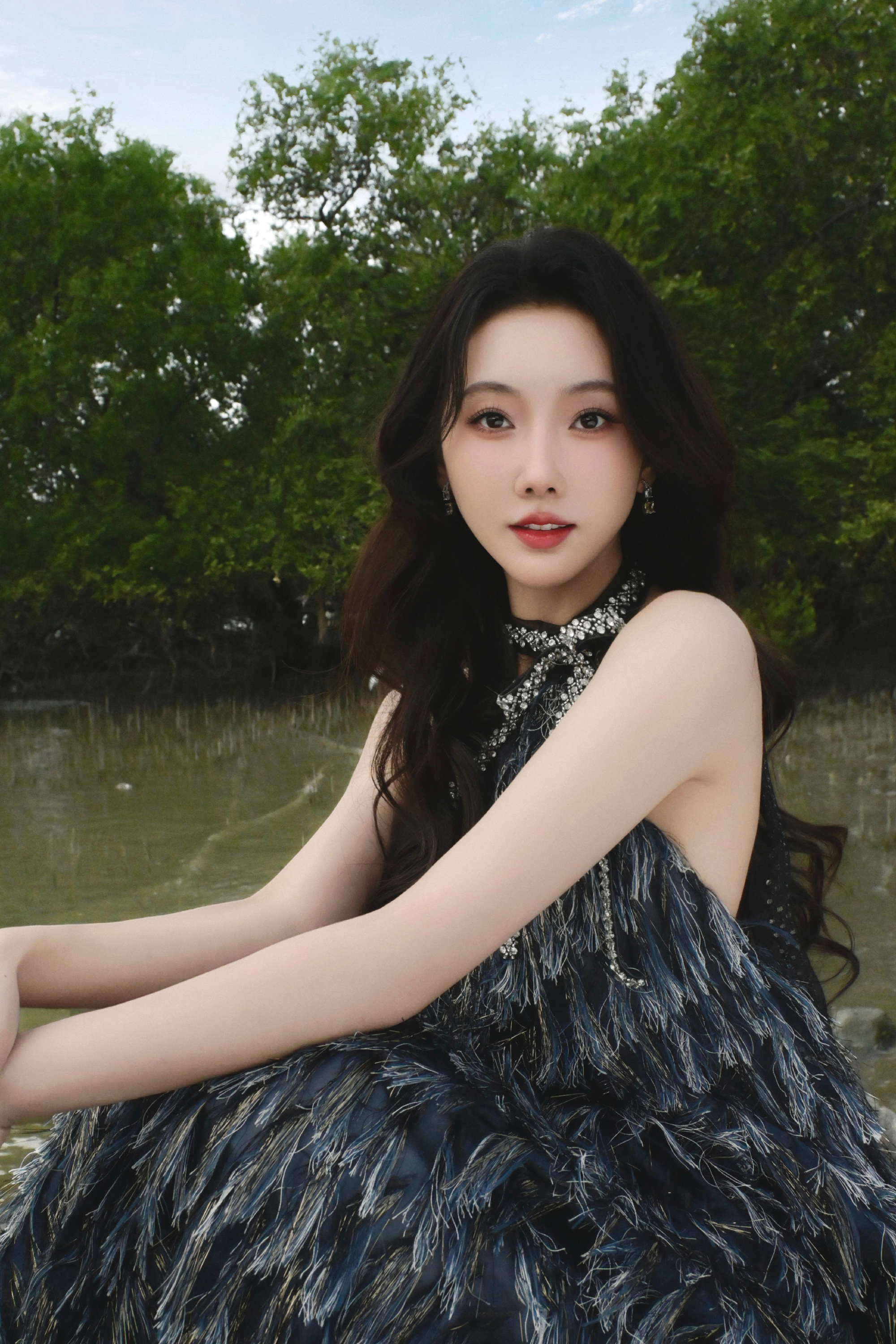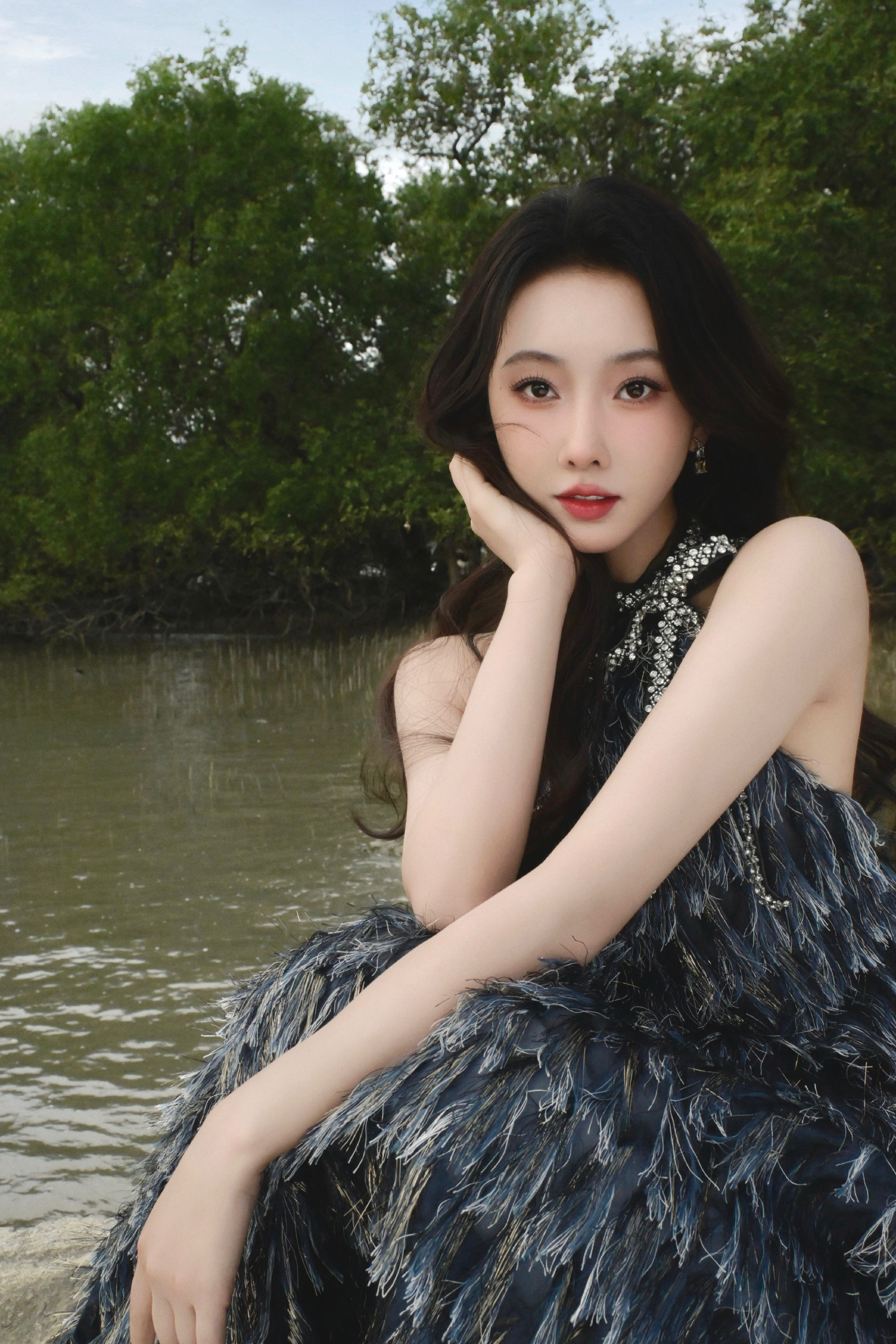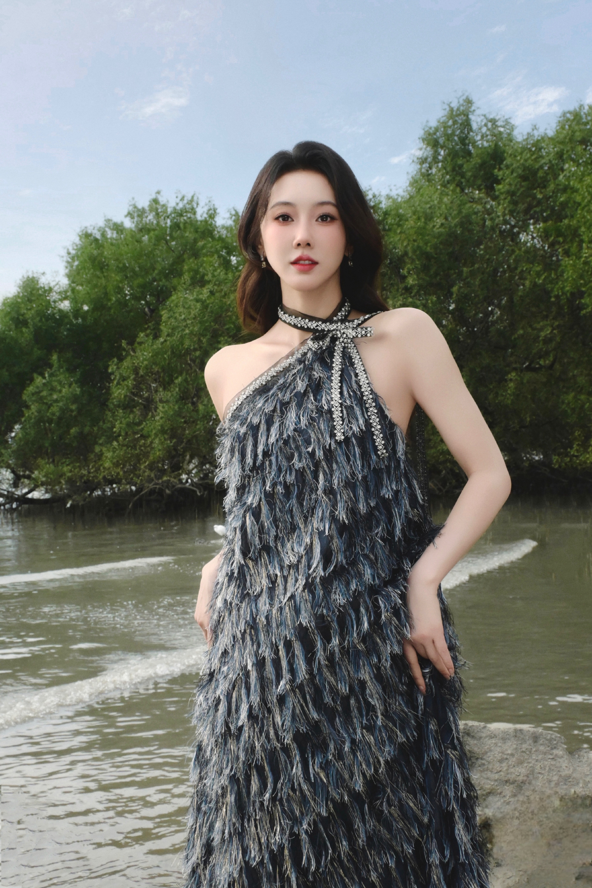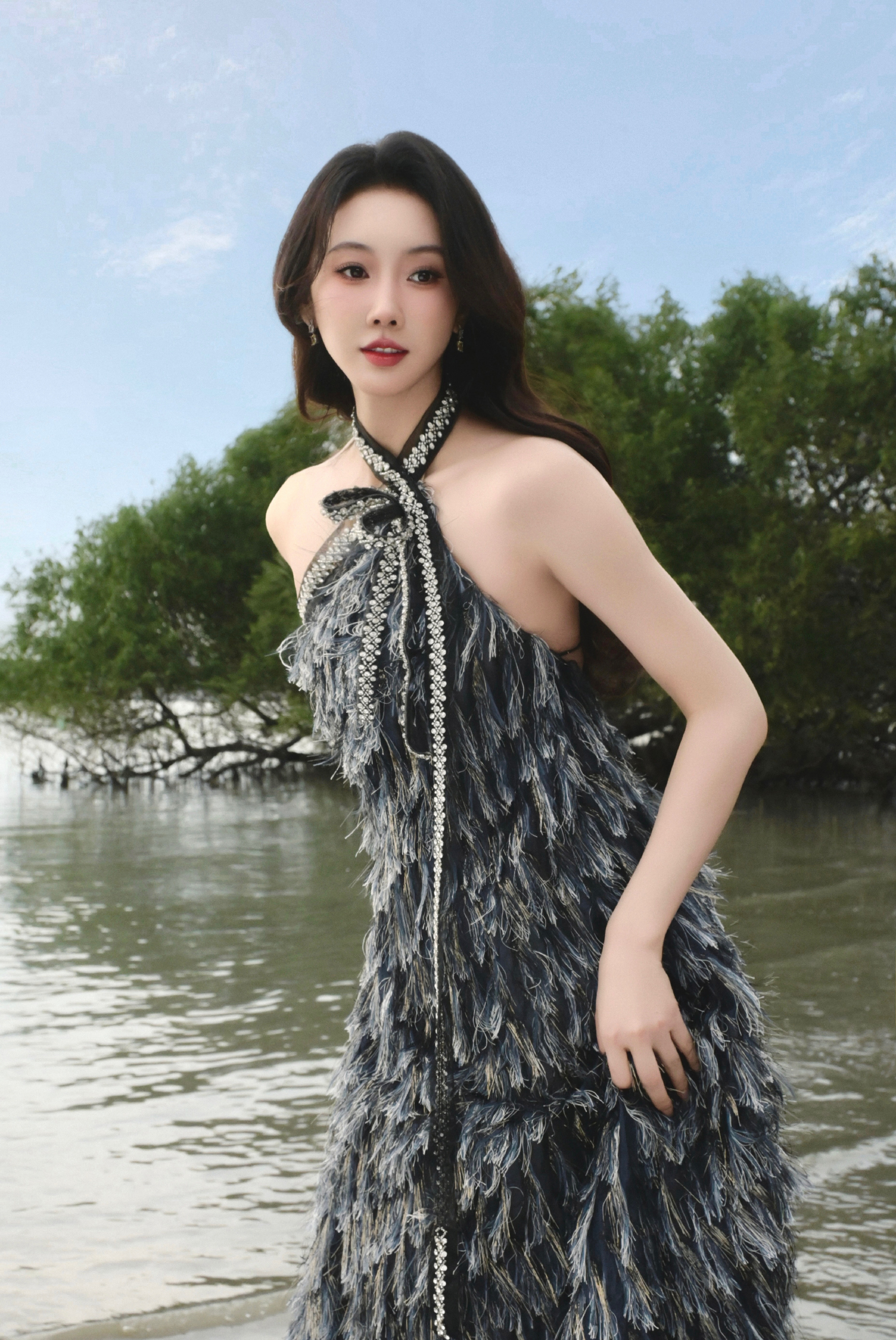 宣璐春日穿搭:穿挂脖羽毛裙的”原野小仙女“。宣璐