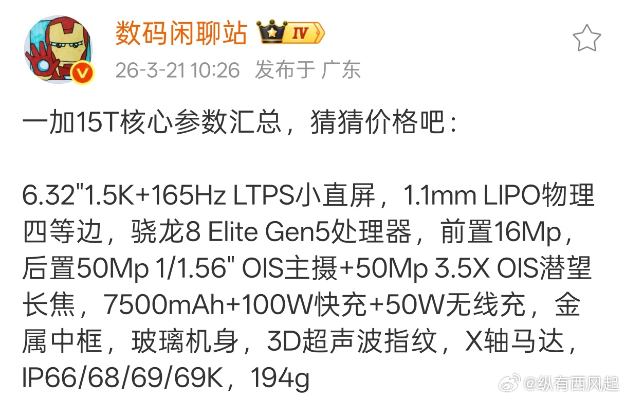 一加15T针机外观小而美,边框真窄!影像方面,李杰爆料:3.5倍潜望长焦镜头,