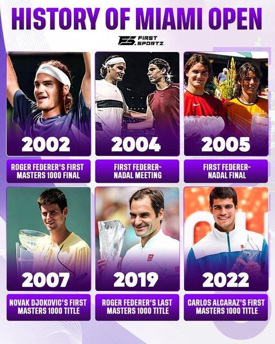 迈阿密公开赛见证了网球历史上的多个标志性时刻✨ ●2002年,费德勒在迈阿密公开赛上首次闯入大师系列赛决赛,但在决赛中不敌卫冕冠军阿加西。 ●2004年,费德勒和纳达尔首次在球场上相遇,正是在迈阿密公开赛上。这标志着最具传奇色彩的体育对决之一的开始。纳达尔以直落两盘的方式击败了当时世界排名第一的费德勒,成功晋级迈阿密公开赛第四轮。 ●2005年,两人在迈阿密双双走到最后,这是他们首次在决赛中相遇,费德勒在五盘惊险的比赛中击败了纳达尔。 ●2007年,德约科维奇在迈阿密赢得了他的首个大师系列赛冠军,这最终创下了他40个大师赛单打冠军的纪录。 ●2019年,费德勒在迈阿密大师赛决赛中以直落两盘的方式击败卫冕冠军伊斯内尔,夺得个人最后一个1000大师赛冠军。凭借这一胜利,37岁的费德勒成为最年长的大师赛冠军。 ●2022年,阿尔卡拉斯在迈阿密赢得了他的首个1000大师赛冠军,成为该赛事历史上最年轻的男子单打冠军。