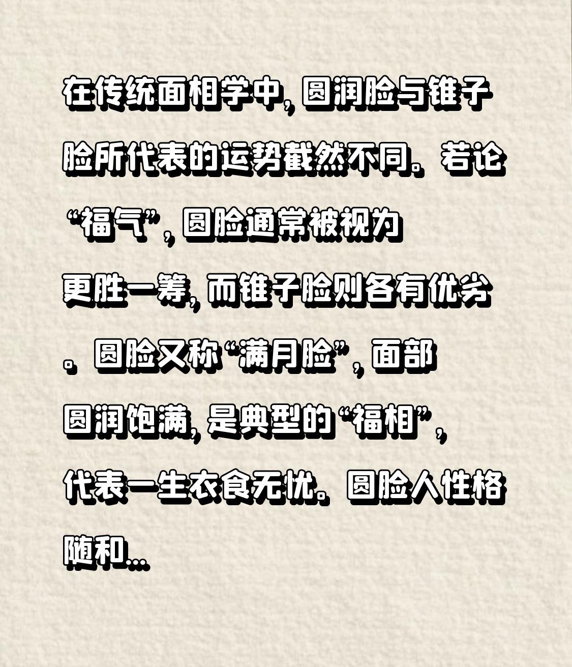 在传统面相学中,圆润脸与锥子脸所代表的运势截然不同。若论“福气”,圆脸通常被视为