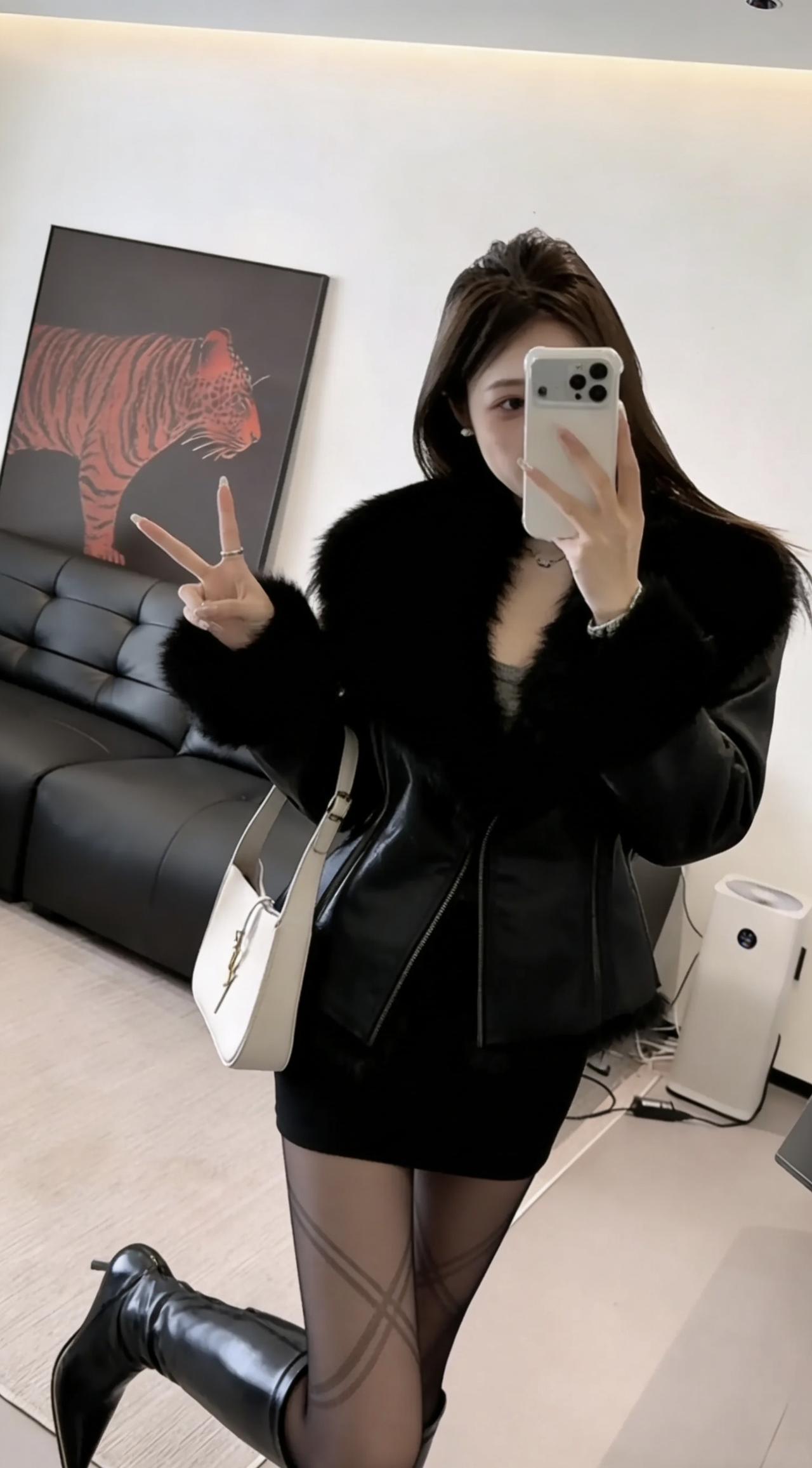 正常穿搭推荐,无不良引导。 今日穿搭是经典的“甜酷辣妹风”,融合了甜酷、优雅与利落的气场,非常吸睛。 穿搭细节解析 1. 核心外套:黑色毛绒拼接皮衣 版型:短款机车夹克版型,修身显瘦,能勾勒上半身曲线。 亮点:领口与袖口拼接厚实的黑色仿皮草毛绒,中和了皮衣的硬朗,增添了富家千金的慵懒贵气感,甜酷感拉满。 2. 内搭与下装:灰色高领内搭 + 印花打底裤。 内搭:简约灰色高领/半高领打底,修身保暖,色调柔和低调。 下装:印花打底裤,极致修饰腿型,暗藏“小心机”。 3. 鞋履:黑色漆皮高跟长靴 亮面漆皮材质与毛绒外套的奢华感呼应,增加气场且兼顾舒适,靴筒包裹性强,尽显大长腿。 4. 配饰:黑色链条小包 简约精致,与整体黑色系穿搭完美呼应,提升精致度。 这套穿搭气场全开又不失女人味,非常适合以下场景: 1. 社交/聚会/约会/晚宴:适合与闺蜜的精致下午茶、浪漫约会或小型派对,既显贵气又显性感。 3. 辣妹风街拍/探店:去网红店打卡、时尚街区街拍,搭配电梯、城市夜景等背景,冷艳高级,出片率极高。 4. 秋冬出街:适合秋季夜间出街或初冬保暖穿搭,既有风度又有温度。