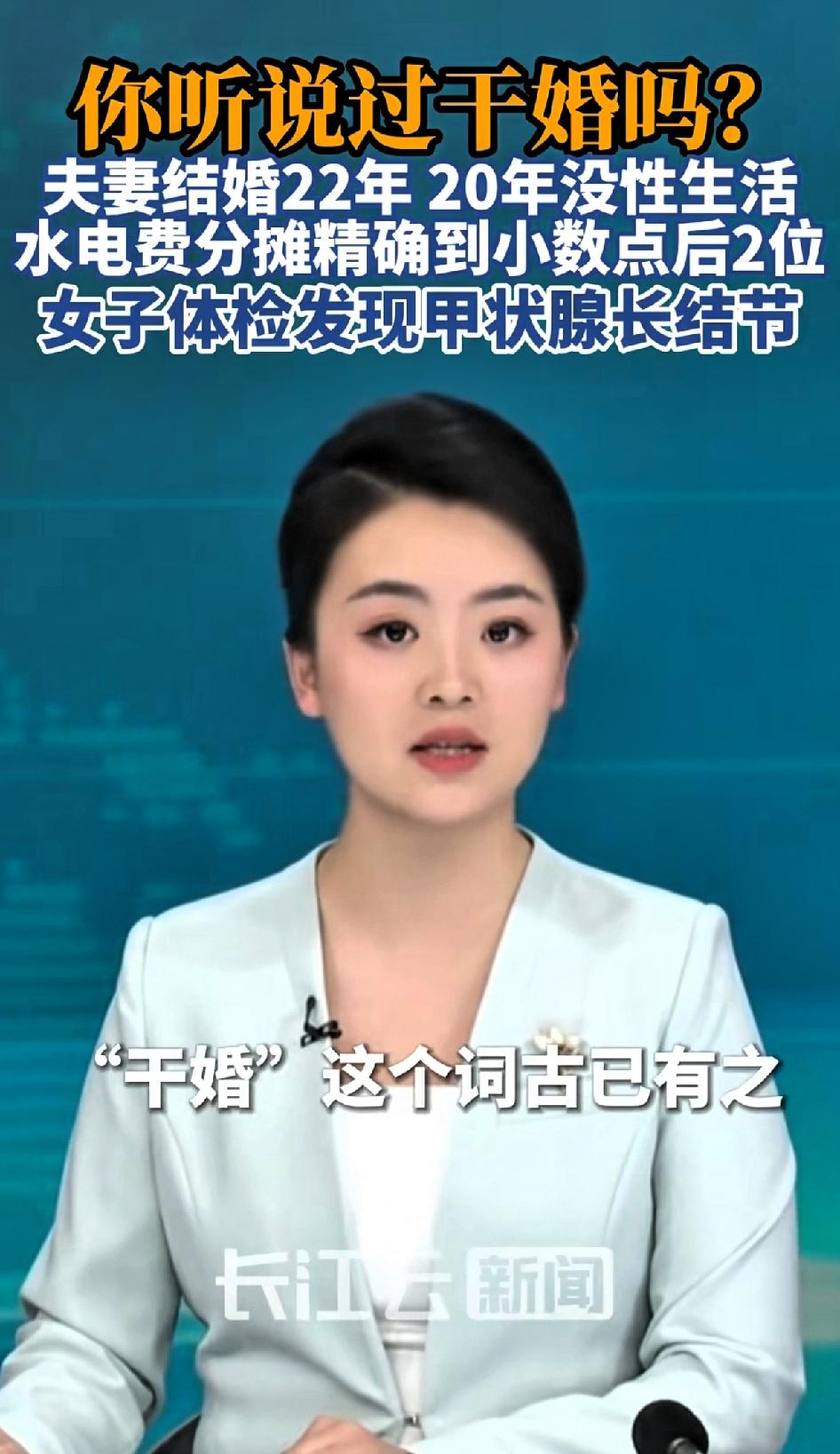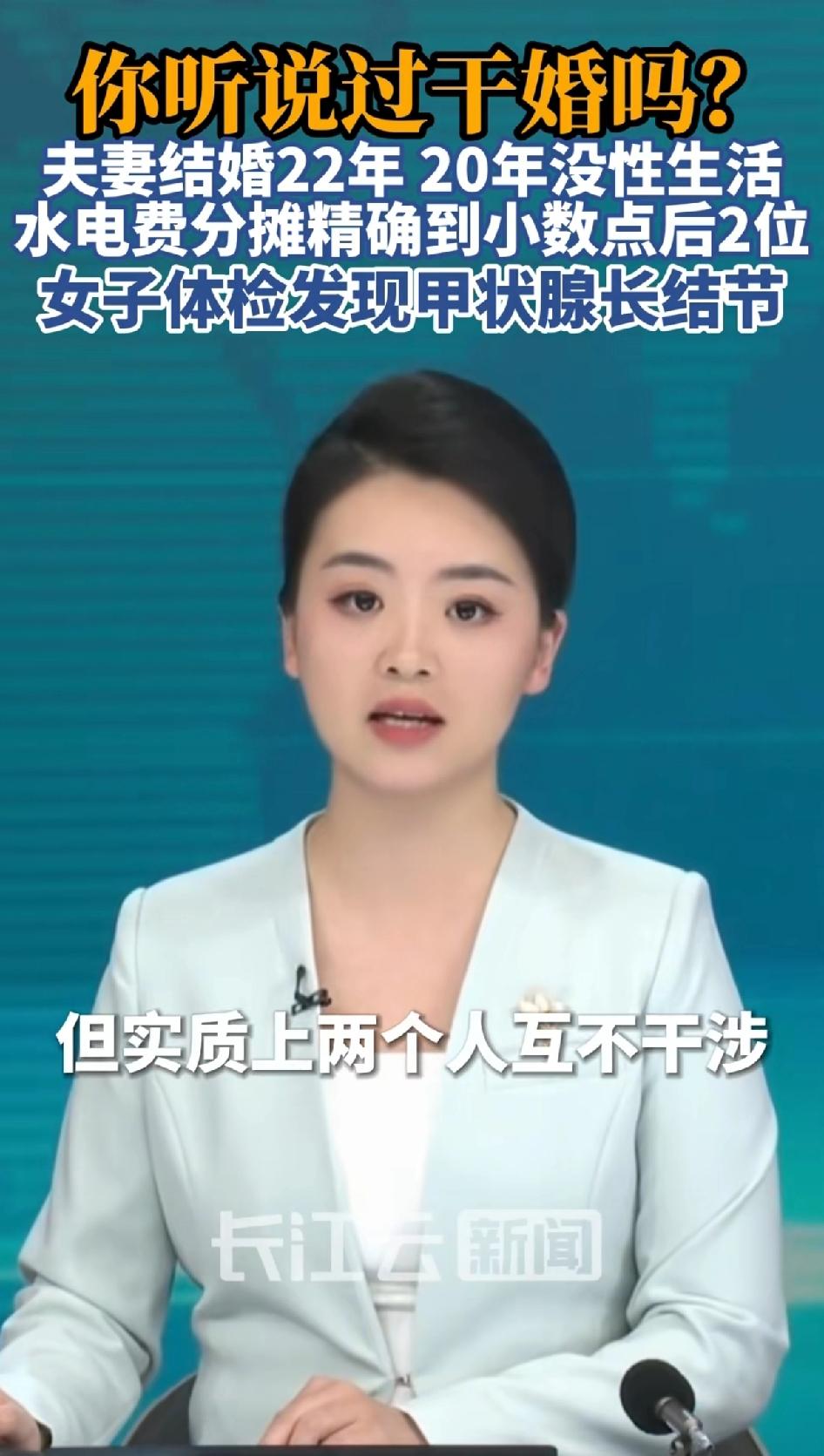 你听说过干婚吗?夫妻结婚22年,20年没性生活,水电费分摊精确到小数点,却没人提离婚。女子体检出甲状腺结节,才发现自己在压抑的环境中生活了22年。 最近“干婚”这个词火了,说的是一对夫妻结婚22年,20年没性生活,水电费分摊精确到小数点。这听起来就离谱,婚姻成了一场精确的“财务合作”。 有个从业近20年的婚姻律师张荆,15年前经手过类似案子。夫妻俩住50平小屋,水电费算得清清楚楚,一方把钢镚放纸条上,另一方凑齐钱去交。两个倔强的人碰到一起了,就这样过了20多年。夫妻过成这样,这才是真正的室友,看似互不伤害,其实内耗满满,相信俩人都是内伤很深。 日子寡淡,却没人提离婚。直到女方查出甲状腺结节,才想结束这压抑的22年。这种“干婚”看似规避风险,实则内伤满满,这样的婚姻,真的还有意义吗?