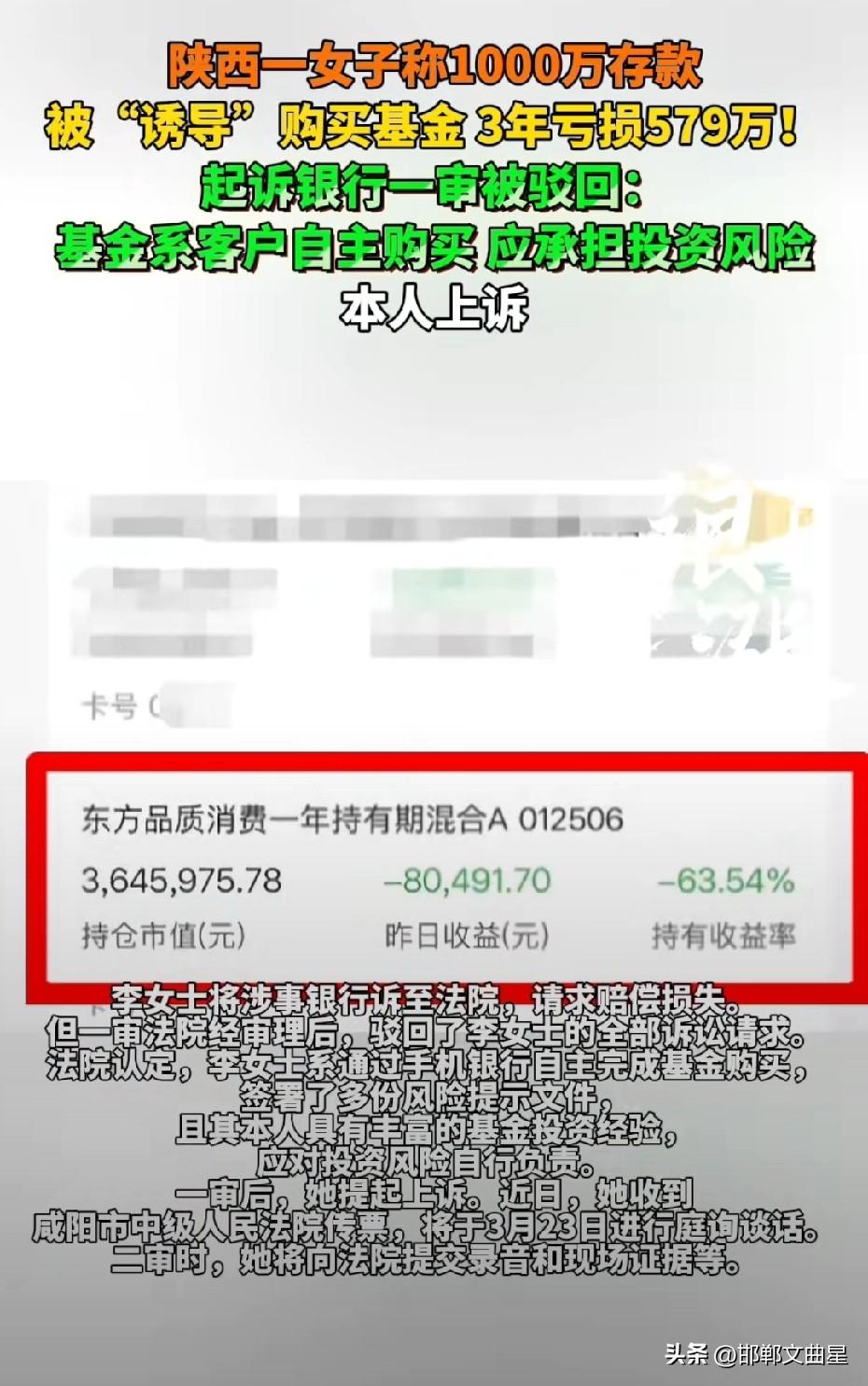 女子1000万买基金亏掉500多万,普通人看完一身冷汗! 近日,陕西咸阳一位女士在银行买了1000万的基金,本想理财增值,结果几年下来亏了超500万。 据说,女子银行卡里有5000万,一位与她关系不错的银行职员找她说,年底充业绩,让她买1000万元基金,一年不可以取出来。 女子看在关系的份上,再说了自己也买过投资基金,就答应了银行职员的,买了1000万基金。 结果,几年下来,1000万元却亏了500万。 女子认为银行职员没说清风险、有诱导嫌疑,还说是银行职员拿她手机操作的,于是把银行告上法庭,结果一审被驳回。 法院认为女子是通过手机银行操作的,手机密码应该自己操作,再者,女子有过购买理财产品的经历,应该懂得购买理财产品的风险。因此,不支持女子的诉讼请求。 对此,有网友表示:一千万不是小数目,亏一半谁都受不了,太心疼了。 还有网友表示:很多人去银行存钱,都被推荐理财、基金,说得特别好,风险却轻描淡写。 还有网友透露:签字的时候一堆纸,根本看不懂,稀里糊涂就买了。 作为一个普通老百姓,看完真的很有感触。 我们辛辛苦苦攒点钱,就想安安稳稳理财,结果一不小心就可能踩坑。 基金不保本,理财有风险,这话真不是说说而已。 银行在销售的时候,不能只讲好处、不讲风险; 通过这件事也提醒大家: 不懂的东西不买,听不懂的产品不碰,说“保本高收益”的一律不信。 钱是自己的,签字之前,一定要多问、多看、多想。 对此,大家怎么看?