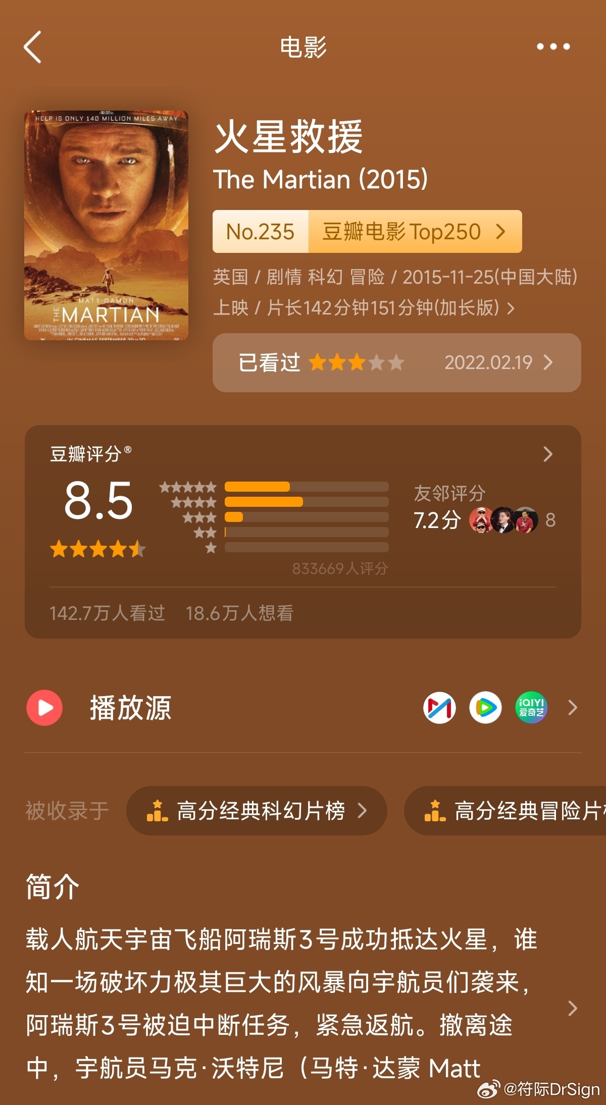 《挽救计划》和《火星救援》同样是安迪·威尔的原著改编电影,映前也一直在被对比,目前豆瓣分一样,评分上可以说旗鼓相当了