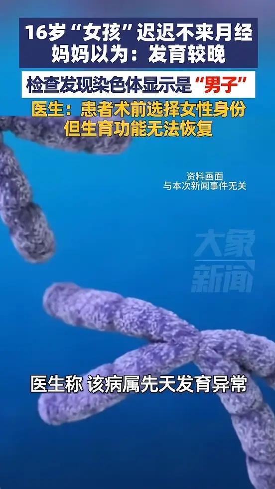 “太意外了!浙江台州,一女孩因为迟迟不来月经,就在妈妈的陪同下去看医生,没想到竟然是46XY单纯性腺发育不全,也就是说,看似女孩的她,实际拥有男性染色体,最后女孩选择了女孩身份,但无法恢复生育功能!网友:这谁能想到! 这个女孩叫可可,今年十六岁。和所有同龄女孩一样,她爱笑爱闹,有着少女的憧憬和烦恼。唯一的异常是,身边的同学陆续来了月经,她的身体却迟迟没有动静。妈妈起初觉得是发育晚,再等等看。可等到十六岁,心里也开始打鼓,这才带她去了医院。 检查结果可可的染色体核型报告上写着“46,XY”,在生物学上这通常意味着男性。可可在生理和心理上,都一直是个女孩。这种病医学上叫“46,XY单纯性腺发育不全”,是一种罕见的先天性发育异常。 简单说,在生命最初的胚胎阶段,可可体内本该发育的“性腺”没有正常形成。因为没有睾丸分泌雄性激素,胎儿的身体在发育过程中,自然朝着女性的方向生长了。所以她出生时看起来就是女孩,十六年来,所有人都理所当然地把她当女孩抚养。 直到青春期到来,真相才浮出水面。没有月经,是因为她体内没有功能正常的卵巢,只有一个极小的始基子宫。而且那些发育不良的性腺组织留在腹腔里,有很高的癌变风险,医生建议要手术切除。 面对这个颠覆认知的真相,可可和父母经历了难以想象的挣扎。十六年的记忆、情感、自我认知,全都建立在“女孩”这个身份上。可可自己坚定地认为,她就是女孩。家人最终决定,尊重她的意愿,继续以女性的身份生活下去。 手术很顺利,切除了隐患。但这条路也有无法弥补的遗憾。术后可以通过补充雌激素和孕激素,让可可的正常发育,也能用药物建立规律的“月经”。但她因为染色体是男性,子宫没有正常发育,将来无法怀孕生育。这对一个花季少女和她的家庭来说,是沉重的枷锁。 孩子青春期的发育,需要多一份细心。如果女孩到了13岁乳房完全没有发育,或者到了15岁仍无月经初潮,就别再简单归咎于“晚长”,一定要及时就医检查。很多性发育异常疾病早期难以发现,青春期是关键的筛查窗口。 可可的选择得到了家人的支持和医生的尊重,这本身就是社会的进步。她的故事告诉我们,生命的形态千差万别,尊重个体的选择与认同,比执着于生物学上的“标准答案”更重要。健康平安地成为自己想成为的人,或许就是生命最大的圆满。 各位读者你们怎么看?欢迎在评论区讨论。